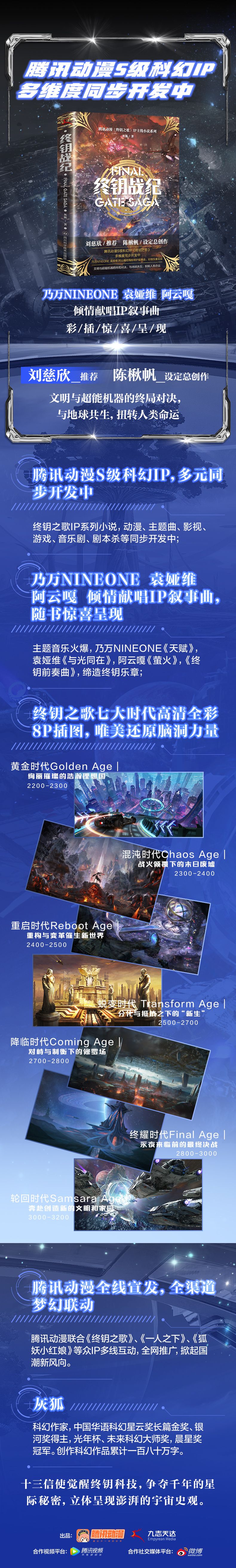 主神 公元2800年,火星。 随着地球和太空联盟在 火星上的最后一个据点被摧 毁,主神知道自己取得了降 临之战的最终胜利。一团耀 眼的光芒出现在显示屏里, 新种星舰队的全体成员毕恭 毕敬地注视着主神。 在新种星,神确实存在 。 在新种星人眼里,是主 神带领他们走出愚昧的黑暗 。新种星的一切科学技术, 都来源于主神的无私馈赠。 新种星人从小接受的教育是 无条件服从主神的一切命令 。主神无处不在,他能够对 新种星上的任何一个人下令 ,没有人会怀疑他做出的任 何决定,这也是新种星人能 在这场战争中取得胜利的原 因。只不过除了主神,没有 人知道这场战争到底是为了 什么。 新种星第三舰队此刻正 在执行主神交代的任务—将 眼前这颗被地球人称为太阳 的天体完全封闭起来。上千 艘工程舰在太阳周围穿梭忙 碌,一个体积比木星还要大 的人工天体正在缓慢诞生。 新种星人相信,主神这么做 一定有他的原因。 为了不让地球人干扰太 阳工程,第三舰队的旗舰“ 新纽约号”一直驻守在地球 南极上空,与驻守在北极的 “水晶剑号”遥相呼应,同时 还使用地磁屏障武器,将地 球人牢牢地限制在地面,确 保没有任何一艘飞行器能够 穿过屏障,飞向太空。 传话者Ⅰ 公元2820年,地球。 本·科瓦科夫看着窗外, 天地间漆黑一片。空中只有 一道不宽的缝隙能够露出外 面的宇宙,零散的几颗星星 在闪烁着微弱的光。 ★腾讯动漫S级科幻IP,动漫、主题曲、影视、游戏、音乐剧、剧本杀等多元同步开发中;腾讯动漫全线宣发,视频号矩阵梦幻联动; ★乃万NINEONE 袁娅维 阿云嘎倾情献唱IP叙事曲,随书惊喜呈现; ★终钥之歌七大时代高清全彩8P插图,唯美还原脑洞力量; ★《三体》作者刘慈欣推荐,陈楸帆设定总创作,给终钥一个支点,翘起整个科幻宇宙; ★十三信使觉醒终钥科技,跨越千年,立体呈现文明与超能机器的终局对决,与地球共生,扭转人类命运。