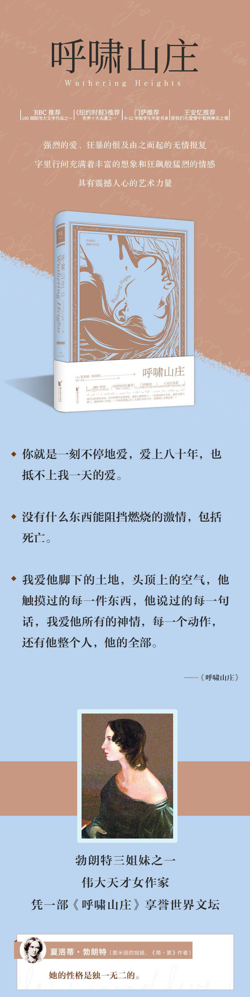 爱米丽·勃朗特(1818~1848),英国女作家。夏洛蒂·勃朗特之妹,安妮·勃朗特之姐。出生于贫苦的牧师之家,曾在生活条件恶劣的寄宿学校求学,也曾随姐姐去比利时学习法语、德语和法国文学,准备将来自办学校,但未如愿。爱米丽性格内向,娴静文雅,从童年时代起就酷爱写诗。1846年,她们三姐妹曾自费出过一本诗集。《呼啸山庄》是她唯一的一部小说,发表于1847年12月。她们三姐妹的三部小说——夏洛蒂的《简·爱》、艾米莉的《呼啸山庄》和小妹妹安妮的《艾格尼斯·格雷》是同一年问世的。除《呼啸山庄》外,艾米莉还创作了193首诗,被认为是英国一位天才的女作家。