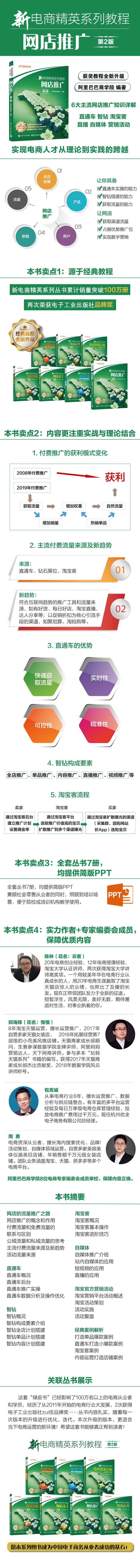 1. 这套“绿皮书”已经影响了100万名以上的电商从业者和学员,经历了从2011年开始的电商行业大发展,2次获得电子工业出版社zui佳品牌奖……丛书内容扎实,随着每一次版本的升级进行优化、迭代。 2. 2019年升级的版本,知识体系更契合前沿,更加符合移动互联网时代及全球化电商运营的现实场景,能为电商从业人员提供更系统化的基础知识。 3. 产教融合更加突出。丛书邀请在实操层面有丰富经验的电商企业家和创业者作为写作团队,同时邀请来自教育部高等学校电子商务类专业教学指导委员会的专家、高等院校的一线教师参与到图书内容的创作与完善当中,既保证了图书内容的切实指导性和可操作性,也保证了图书内容的逻辑性和条理性。 4. 学习使用更加便利。编写团队在创作初期便充分考虑如何让升级版教材既适合市场零售读者阅读,又能够更广泛地应用到高等院校中。因此,本套丛书根据对高校学生培养的特点做了相关设计,如在大部分章节安排有练习题,每本书都配有PPT课件等。 5. 本书是“新电商精英系列教程”升级版中的一本,全套丛书包括: 《电商运营(第2版)》ISBN 978-7-121-36618-5 《网店客服(第2版)》ISBN 978-7-121-36633-8 《网店美工(第2版)》ISBN 978-7-121-36616-1 《电商数据分析与数据化营销》ISBN 978-7-121-36613-0 《网店推广(第2版)》ISBN 978-7-121-36617-8 《跨境电商运营实务:跨境营销、物流与多平台实践》ISBN 978-7-121-36615-4 《内容营销:图文、短视频与直播运营》ISBN 978-7-121-36614-7