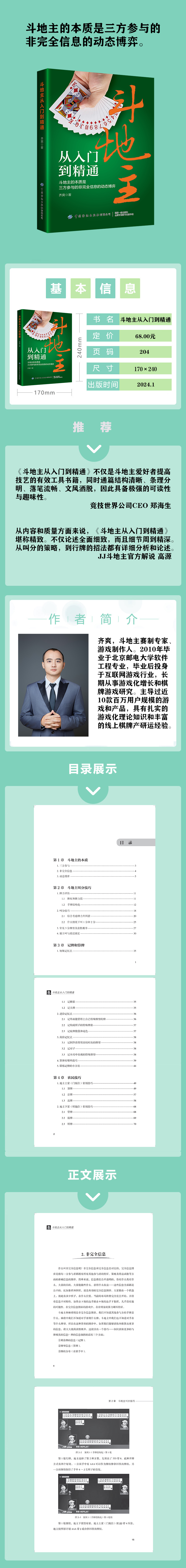 斗地主从入门到精通 出版时间 2024-01-01T00:00 其它运动 4580 作者: 齐爽|责编:曹炳镝//段子君 出版社: 中国纺织 原售价: 68.00 折扣价: 46.92 折扣购买: 斗地主从入门到精通 ISBN: 9787522911571 作者简介 齐爽,游戏制作人、斗地主赛制专家。2010年毕业于北京邮电大学软件工程,毕业后投身于互联网娱乐,长期从事斗地主赛制研究和游戏化增长,主导过近10款百万级规模的游戏和产品,具有扎实的理论基础和丰富的线上斗地主产研运经验。 内容简介 上一篇:健美操理论与实践下一篇:肌肉与力量(精准锻炼每一条肌纤维)