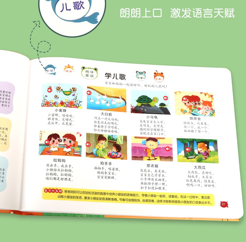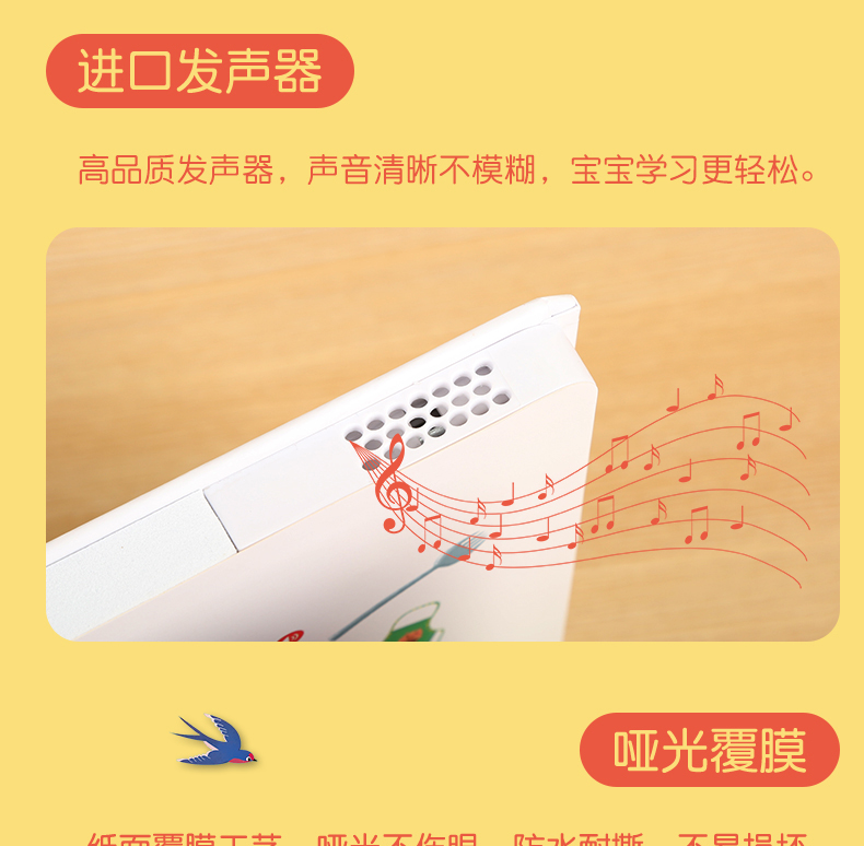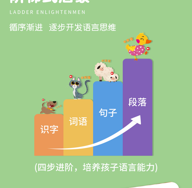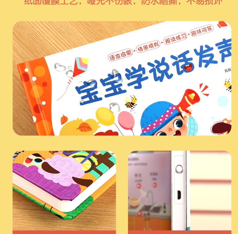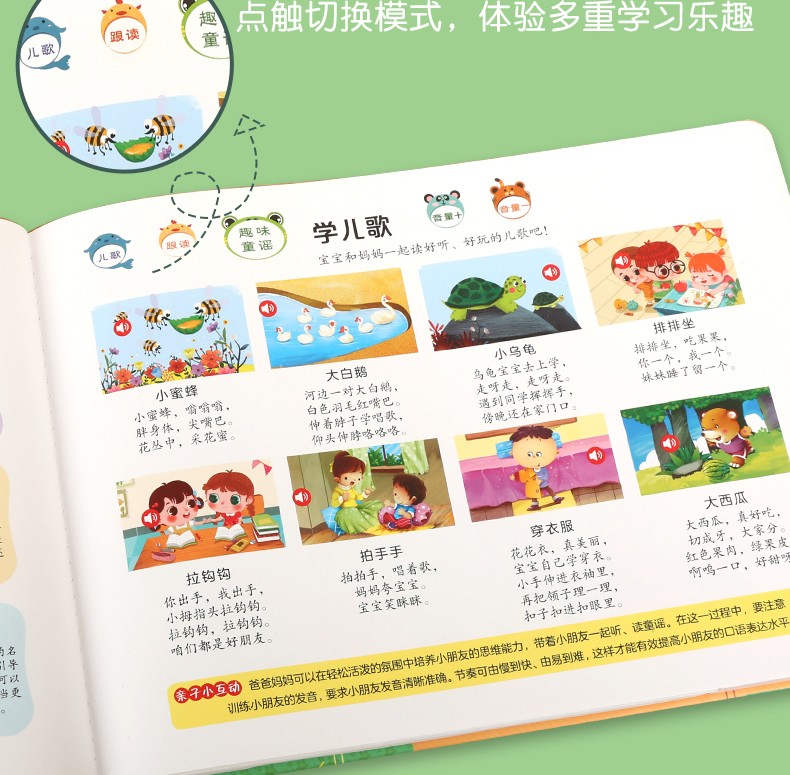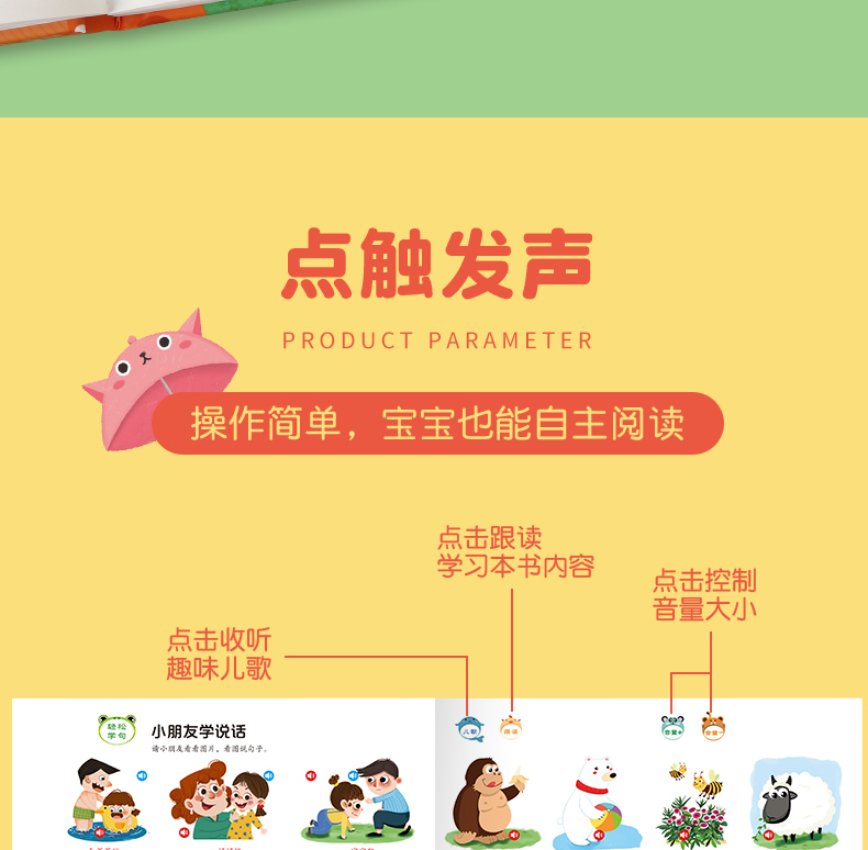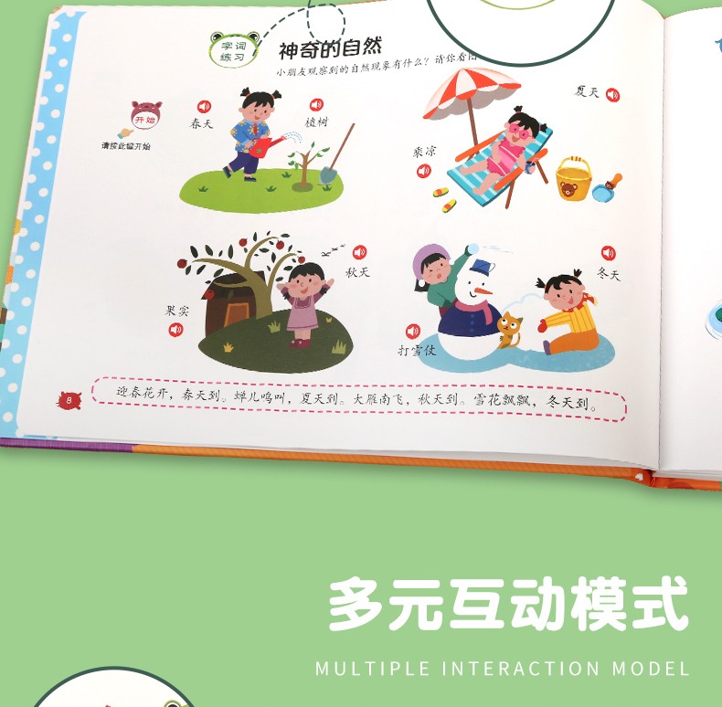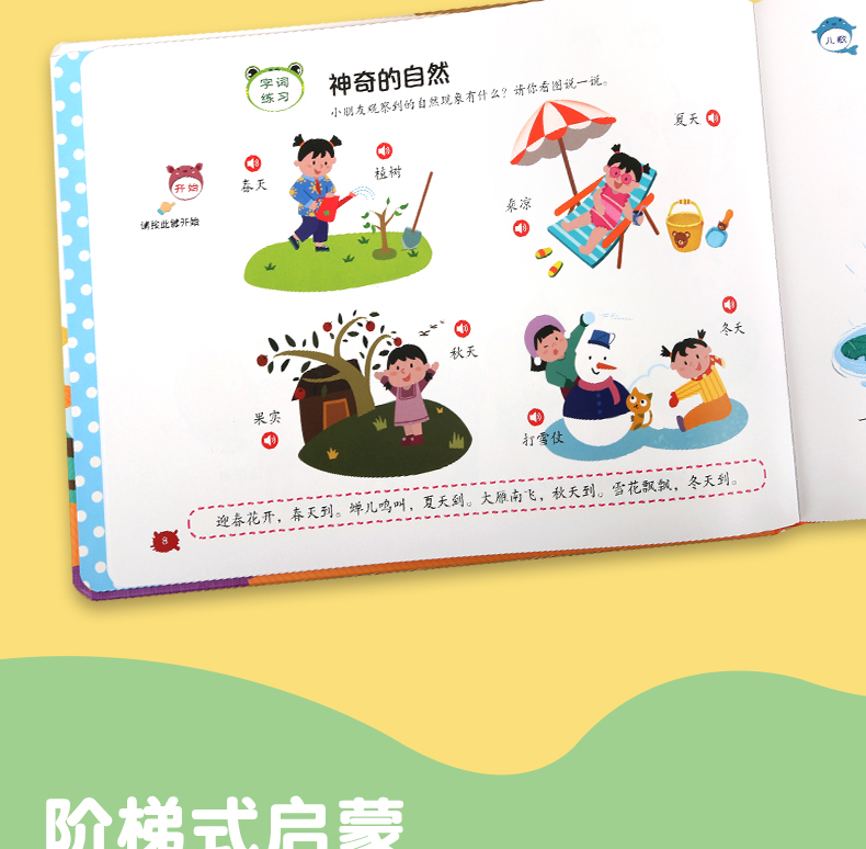 1.13大主题内容,画面皆是孩子所喜爱的场景和事物,让孩子通过画面联想记忆,增强学习效果; 2.内容编排科学合理,循序渐进,“字—词—句—段落”阶梯式训练,逐步开发语言思维,符合该年龄段需求; 3.标准的汉语发音,操作简单的按键,帮助孩子实现自主阅读,引导孩子学说话、会说话、爱说话; 4.听、触、看、说,四大感官体验,互动式阅读体验,激发孩子的好奇心与阅读兴趣; 5.内容丰富详实,多角度阅读,可点读、跟读、测试学习成果。