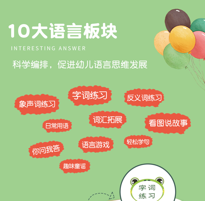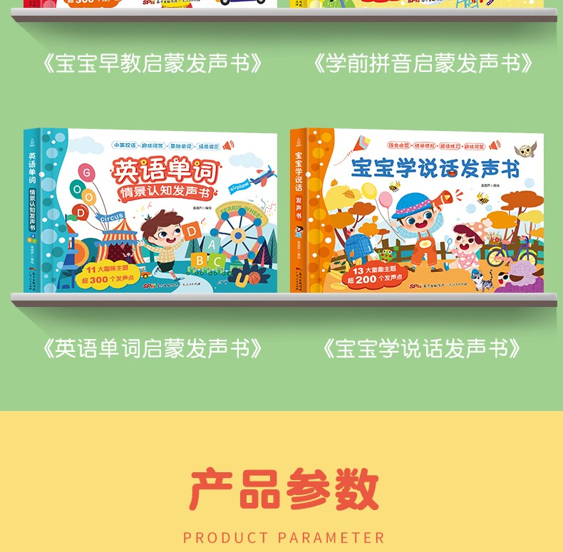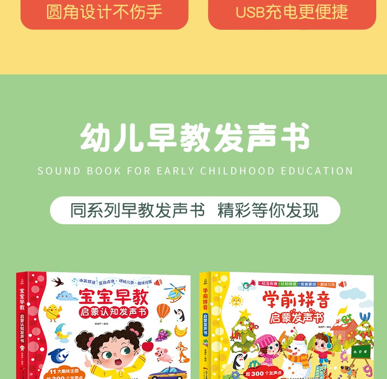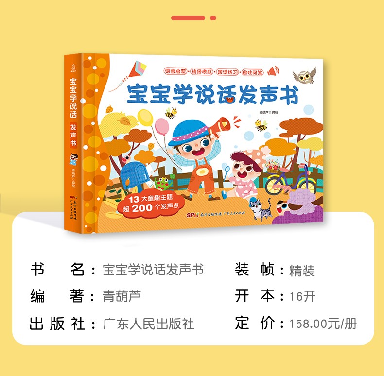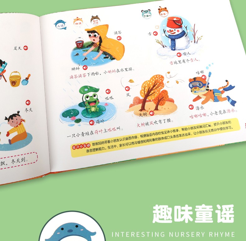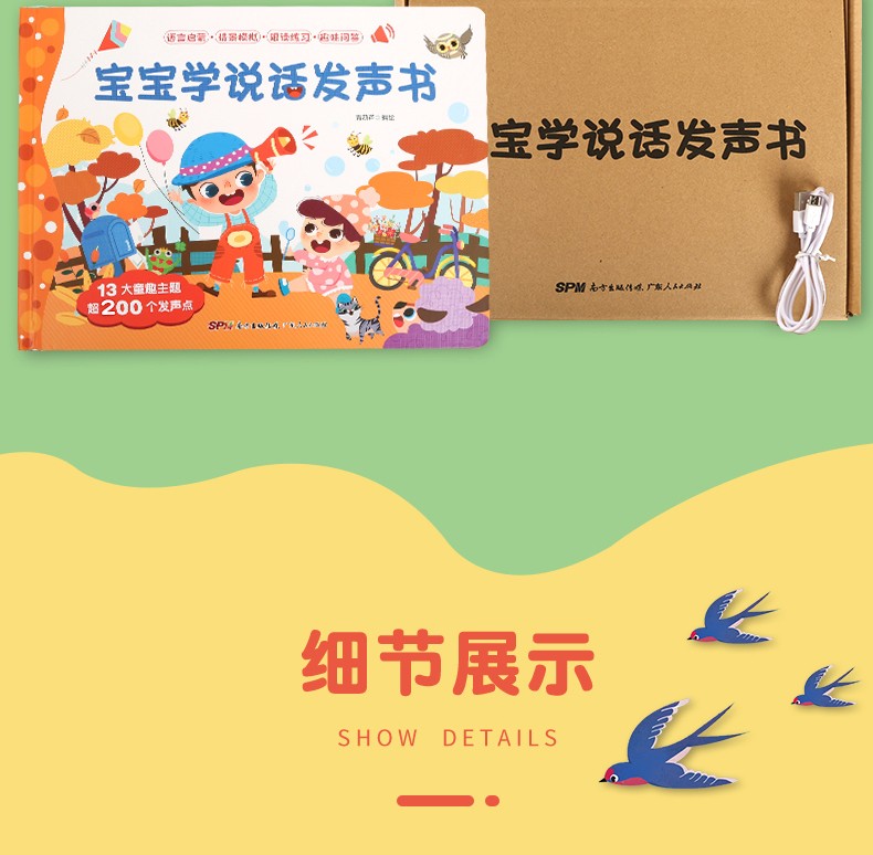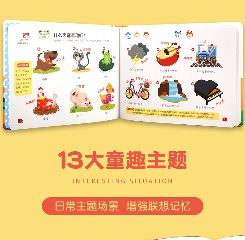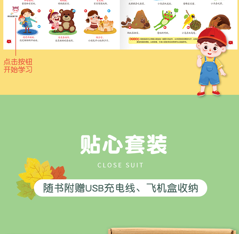 1.13大主题内容,画面皆是孩子所喜爱的场景和事物,让孩子通过画面联想记忆,增强学习效果; 2.内容编排科学合理,循序渐进,“字—词—句—段落”阶梯式训练,逐步开发语言思维,符合该年龄段需求; 3.标准的汉语发音,操作简单的按键,帮助孩子实现自主阅读,引导孩子学说话、会说话、爱说话; 4.听、触、看、说,四大感官体验,互动式阅读体验,激发孩子的好奇心与阅读兴趣; 5.内容丰富详实,多角度阅读,可点读、跟读、测试学习成果。