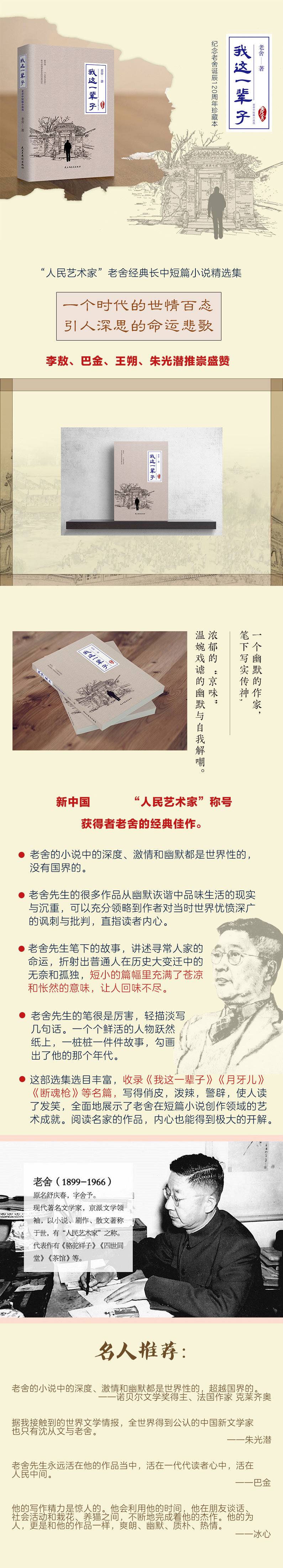 老舍(1899—1966),中国现代小说家、著名作家,原名舒庆春,字舍予,北京满族正红旗人。杰出的语言大师,新中国第一位获得“人民艺术家”称号的作家。老舍的一生,总是忘我地工作,他是文艺界当之无愧的“劳动模范”。曾担任全国文联副主席、全国作协副主席、北京市文联主席等职。代表作有小说《骆驼祥子》《四世同堂》《我这一辈子》等,戏剧《茶馆》《龙须沟》等。