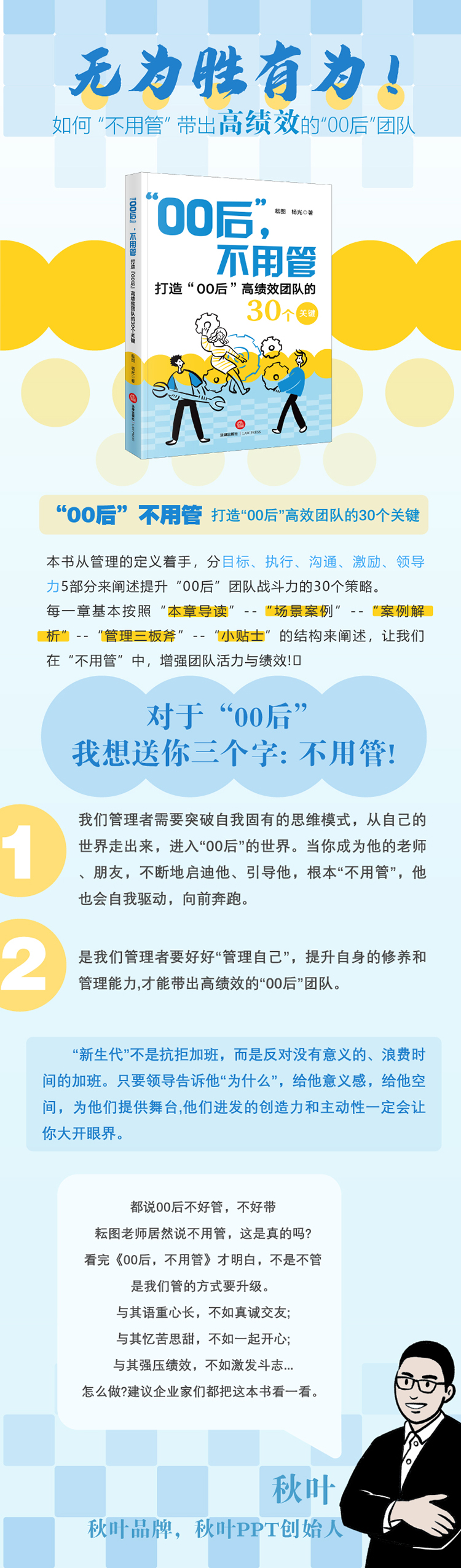 对于“00后”,我想送你三个字:不用管!“,不用管”有两层含义: 第一层含义,是我们管理者需要突破自我固有的思维模式,从自己的世界走出来,进入“00后”的世界。当你成为他的老师、朋友,不断地启迪他、引导他,根本“不用管”,他也会自我驱动,向前奔跑。 第二层含义,是我们管理者要好好“管理自己”,提升自身的修养和管理能力,才能带出高绩效的“00后”团队。 “新生代”不是抗拒加班,而是反对没有意义的、浪费时间的加班。只要领导告诉他“为什么”,给他意义感,给他空间,为他们提供舞台,他们迸发的创造力和主动性一定会让你大开眼界。 英国有这样一句谚语:“目标刻在石头上,计划写在沙滩上。”这个观点,我非常认同。目标刻在石头上,是指设定目标后轻易不可改变;而写在沙滩上的计划,是可以随着事情发展而灵活调整的。 “山不过来,我就过去。” 作为领导者,我们需要顺应时代的变迁,更需要迭代公司的管理模式,了解“00后”员工的想法,竭尽所能激发出年轻人在工作中的成就感,培养他们成为“领头狼”,营造公司积极澎湃的团队氛围。