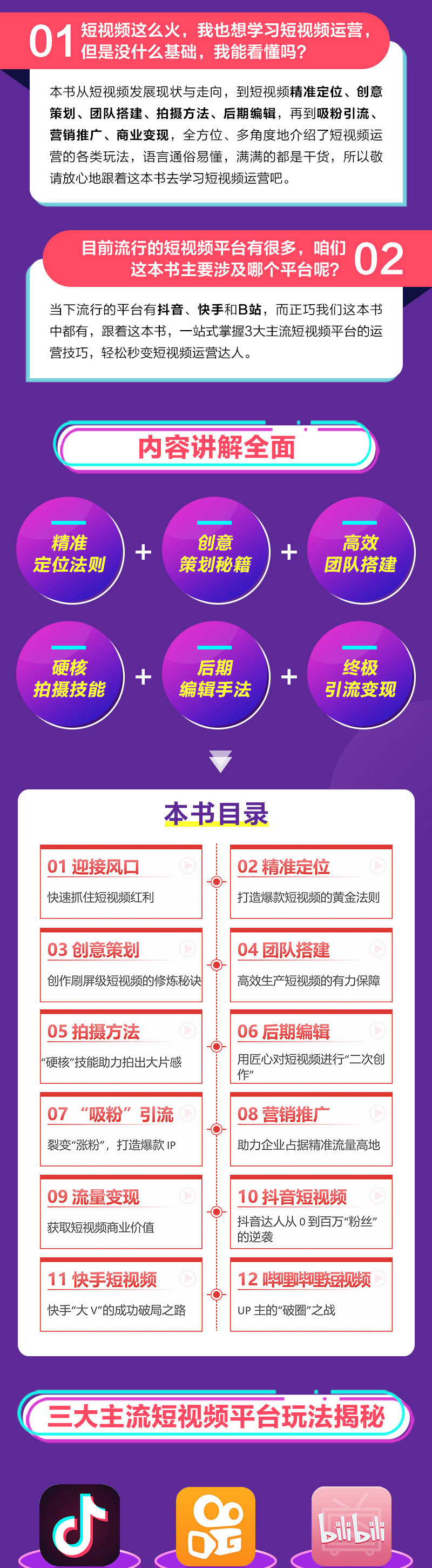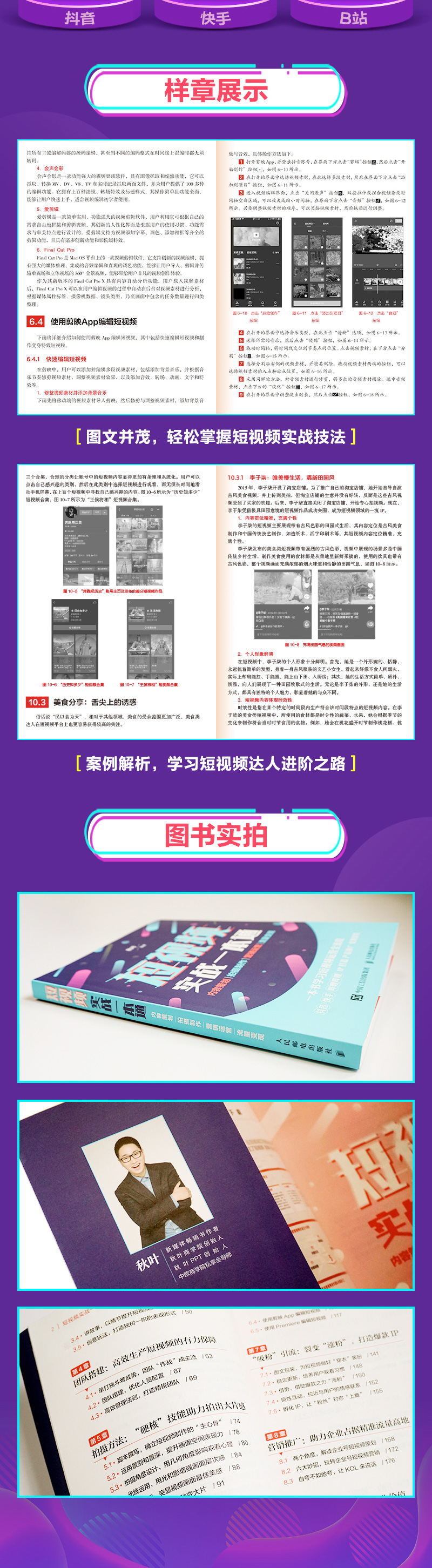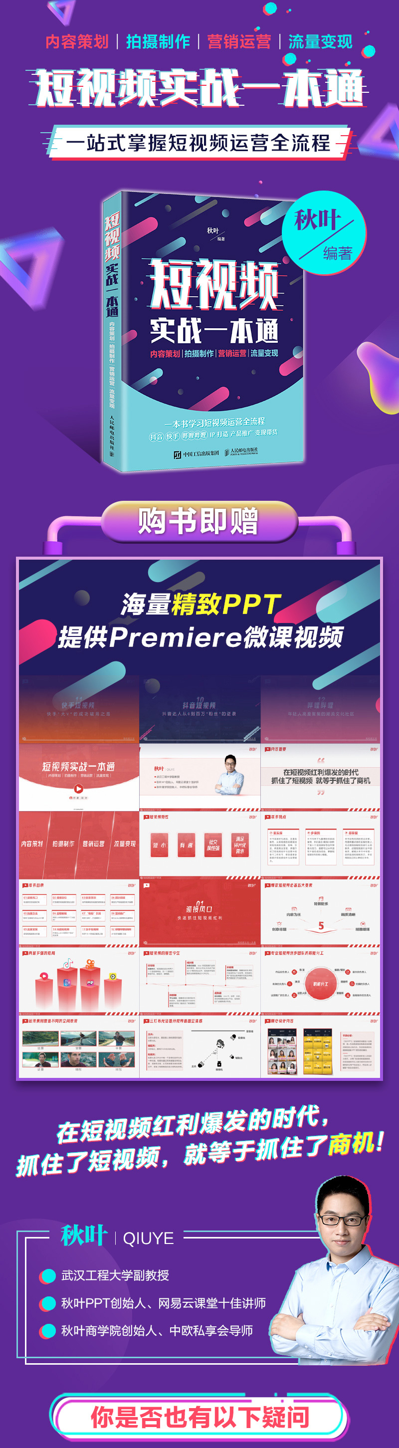新媒体营销领域大V秋叶大叔倾情出品 囊括抖音、B站、快手三大平台经典案例 购书赠送秋叶团队精心制作的海量图书配套PPT课件 购书赠送Premier课程微课视频 一本书囊括短视频策划、拍摄、运营、变现全流程