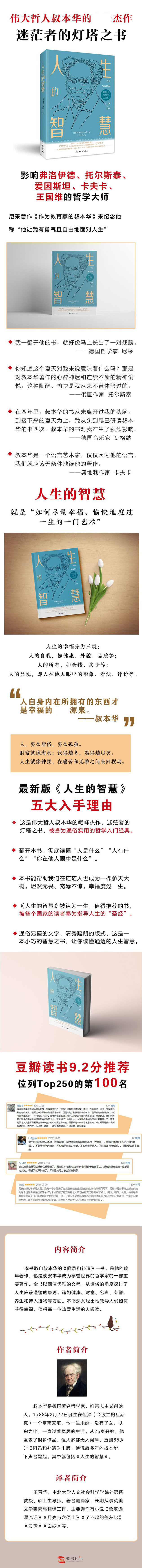 \\\\\\\"在这部小书里,我所讲的“人生的智慧”是就其最一般的意义而言的,人生的智慧在这里就是指如何安排生活的艺术,以便使我们的一生能获得最大限度的快乐和成功;有关这门艺术的理论可称之为“幸福论”,因为它教导人们如何去享有幸福的人生。或许,这样的一种生存可以说是绝对优于非生存的,如果我们是从纯粹客观的角度去看,或者更确切地说,如果是经过了我们冷静和缜密的思考的话(因为这里涉及主观的判断)。根据这个定义我们可以推断,我们依恋于这种生存是因为其本身的缘故,而不仅仅是出于对死亡的恐惧,并且我们希望这一生存能够永远延续。 当然,人生是否或者能否与如此定义的生存相吻合,还是个问题,大家都知道,我的哲学体系对此给予了否定的回答。但哲学上的幸福论却必须对这一问题预设肯定的答案。在我的一部主要著作《作为意欲和表象的世界》第二卷第四十九章里,我已表明过我的观点:这一假设(预设)的主要依据是错误的。因此,在阐述这一生存的艺术时,我不得不放弃这更高一级的形而上和道德的审视角度,而迁就于我自己理论中所形成的观点。我在这里所讲的一切从某种程度上说都经过了折中的处理,也就是说,在这本书里我所采取的是一种日常生活的实用的观点,这也就不可避免地带有了这一观点根子里必有的弊端。因此,我的论述只具很有限的价值,其实,幸福论(eudamonologie)这个词本身就是个委婉语。另外,我的议论也谈不上完整彻底,因为这一题目是不可穷尽的,因为如果要是全面展开这个话题,我就不得不把前人在这一方面已有的论述再重复一遍。 就我的记忆所及,其宗旨与我写这部箴言书大体上相近的,唯有卡丹努斯所写的《论逆境》。他的这本书值得一读,可作为我这本书的补充。虽说亚里士多德在他的《修辞学》第一部第五章里有几段关于幸福论方面的讲述,可那也只是些泛泛而论。因为汇编别人的话语并不是我的工作,所以我没有利用这些前辈们的著作。尤其是因为在汇编的过程当中,难免会丢失掉自己观点中的独特性,而独特性的观点则是这类著作的灵魂。当然,一般来说,历代的智者总是讲着同样的事情,而构成历代社会绝大多数的愚人们也是做着一样的事情,做着与智者们恰为相反的事情,而且,这种情形仍将会持续下去。正如伏尔泰所说的,“在我们离世时我们会发现这个世界仍然像我们刚到来时一样的愚蠢和邪恶。”\\\\\\\" ★这是伟大哲人叔本华的巅峰杰作,迷茫者的灯塔之书,被誉为通俗实用的哲学入门经典。 ★翻开本书,彻底读懂“人是什么”“人有什么”“你在他人眼中是什么”。 ★本书能帮助我们在茫茫人世成为一棵参天大树,坦然无畏、宠辱不惊,幸福度过一生。 ★《人生的智慧》被认为一生最值得推荐的书,被各个国家的读者奉为指导人生的“圣jing”。 ★通俗易懂的文字,清秀疏朗的版式,这是一本小巧的智慧之书,让你读懂通透的人生智慧。