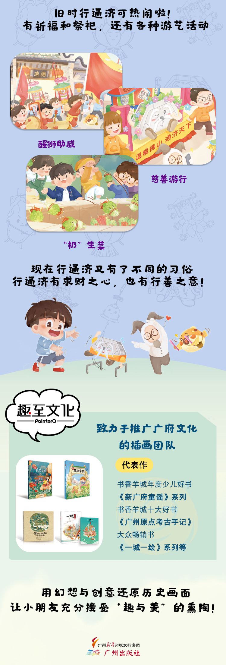 广州趣至文化创意有限公司,专为党政军机关、事 业单位、央企、国企、品牌企业等机构提供文化创意及文化传播服务。多年来致力于文化、艺术、传播领域,主营IP卡通形象、插画、动画、文创 产品、设计创意、培训课程、工程实施、整合媒体传播、视频制作、活动 策划等业务,通过推动文化建设的IP化、数据化、数字化,全力构建各个机构的数字文化。趣至文化也一直深耕地域文化,传承地域文化。目前已出版书籍《小时候的广州》《一城一绘》《新广府童谣》《广州原点考古手记》《广州风情》《趣向未来》等。