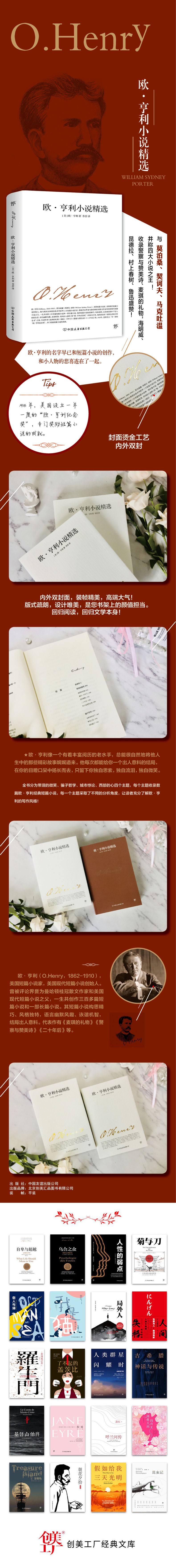 欧亨利(O.Henry,1862-1910),美国短篇小说家,美国现代短篇小说创始人。他与契诃夫、莫泊桑、马克吐温并称世界四大短篇小说之王,曾被评论界誉为曼哈顿桂冠散文作家和美国现代短篇小说之父,一生共创作三百多篇短篇小说和一部长篇小说。其短篇小说构思精巧、风格独特,语言幽默风趣、诙谐机智,结局出人意料。代表作有《麦琪的礼物》《警察与赞美诗》《二十年后》等。1918年,美国设立一年一度的“欧亨利纪念奖”,专门奖励短篇小说的成就。