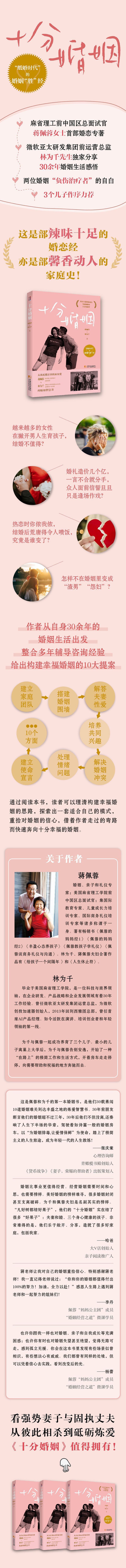 ◎ 麻省理工前中国区总面试官蒋佩蓉女士首部婚恋专著,独家分享与微软亚太研发集团前运营总监林为千先生30余年婚姻生活感悟。 ◎ “纸婚时代”的10剂解药。本书提供全框架式指导和丰富案例,从成家独立、解决冲突到使命方向环环相扣,系统呈现了建立十分幸福的婚姻所要了解的一切。 ◎ 两位婚姻“负伤治疗者”的自白。没有天生的婚姻专家与神仙眷侣,只有跌跌撞撞与破碎重建。看强势妻子与固执丈夫如何从彼此相杀到十分相爱。 ◎ 妻子丈夫联袂创作,3个儿子做序推荐。这是部辣味十足的婚恋经,亦是部馨香动人的家庭史。