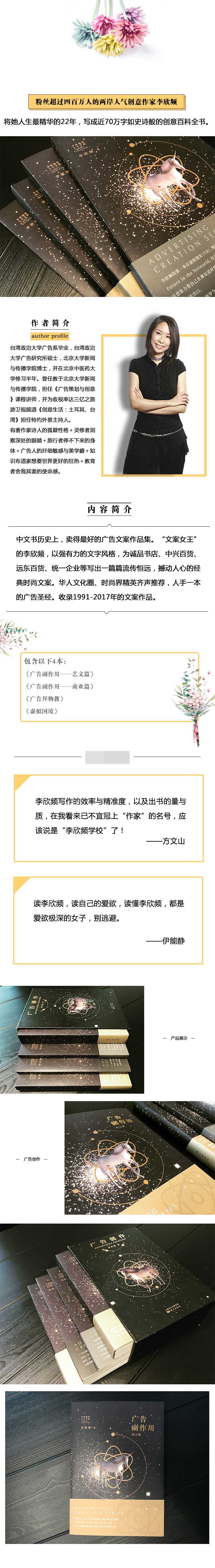 李欣频,台湾政大广告系毕业、政大广告研究昕硕士、北京大学新闻与传播学院博士,并在北京中医药大学修习半年。并曾于北京大学新闻与传播学院任教《广告策划与创意》课程长达四年。曾任大陆旅游卫视频道《创意生活:土耳其、台湾》特约外景主持人。 有着作家诗人的孤僻性格+冥想者洞察深处的眼睛+旅行者停不下来的身体+广告人的纤细敏感与美学癖+知识布道家想要世界更好的狂热+教育者舍我其谁的使命感。曾任广告公司文案、诚品书店特约文案、宏基数码艺术中心特约文案刨意。 2004年数字时代杂志选为台湾百大创意人之一。天下远见文化事业群之《30杂志》2006年9月号,选为创意达人之一。入选搜狐2009年度时尚人物创意家。于2013年7月入选腾讯名人访问团参访韩国。入围2013年中国作家富豪榜,同年获得COSM0年度女性梦想大奖、讲义杂志年度最佳旅游作家奖。 散文作品被收录于《中华现代文学大系》散文卷。文案作品被选入《台湾当代女性文选》。2009年台湾金石堂“2012书展”选为不可错过的八位作家之一。2010年统一企业主办网络票选年轻人心目中最喜欢的十大作家之一。 目前已经旅行全球50余国。