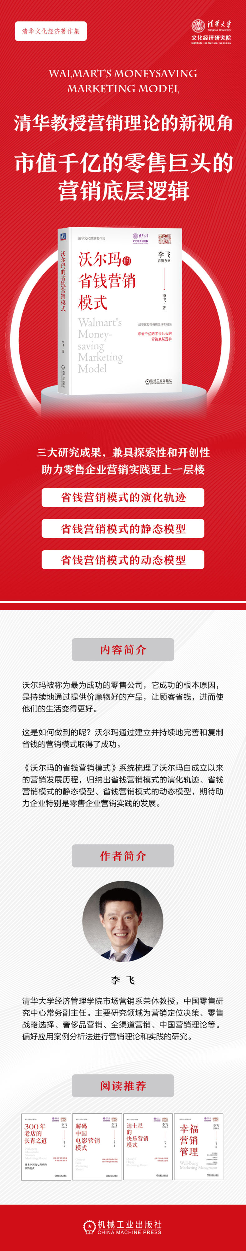 沃尔玛的省钱营销模式 出版时间 2024-04-01T00:00 市场营销 8563 作者: 李飞 出版社: 机械工业 原售价: 79.00 折扣价: 51.40 折扣购买: 沃尔玛的省钱营销模式 ISBN: 9787111751854 作者简介 李飞<br />清华大学经济管理学院市场营销系荣休教授,中国零售研究中心常务副主任。主要研究领域为营销定位决策、零售战略选择、奢侈品营销、全渠道营销、中国营销理论等。偏好应用案例分析法进行营销理论和实践的研究。 内容简介 清华文化经济著作集 清华教授营销理论的新视角 市值千亿的零售巨头的营销底层逻辑 上一篇:营销调研策划与实施(第三版)下一篇:董事会秘书行权履职工作指南