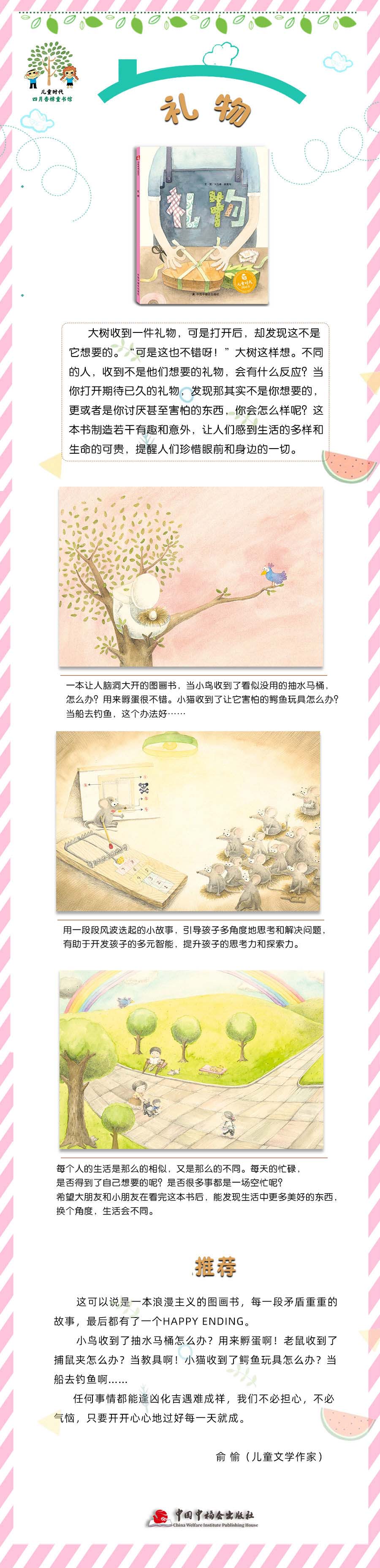 这可以说是一本浪漫主义的图画书,每一段矛盾重重的故事,最后都有了一个Happy Ending。小鸟收到了抽水马桶怎么办?用来孵蛋啊!老鼠收到了捕鼠夹怎么办?当教具啊!小猫收到了鳄鱼玩具怎么办?当船去钓鱼啊……任何事情都能逢凶化吉遇难成祥,我们不必担心,不必气恼,只要开开心心地过好每一天就成。 —— 俞 愉(儿童文学作家) 每个人的生活是那么的相似,又是那么的不同。每天的忙碌,是否得到了自己想要的呢?是否很多事都是一场空忙呢?当自己很努力,结果得到的不是自己想要的,人们会用什么态度去面对呢?于是就有了创作《礼物》这本图画书的最初灵感。希望大朋友和小朋友在看完这本书后,能发现生活中更多美好的东西,换个角度,生活会不同。 —— 响马夫妇(知名插画师) 在中国大陆,做原创图画书中,你们是最有感觉的! ——梅子涵(著名儿童文学作家 上海师范大学博士生导师)