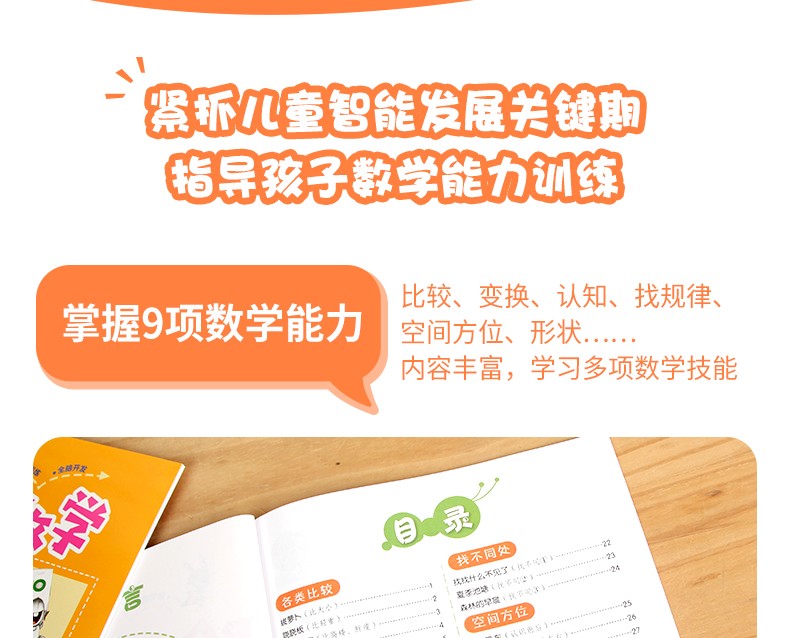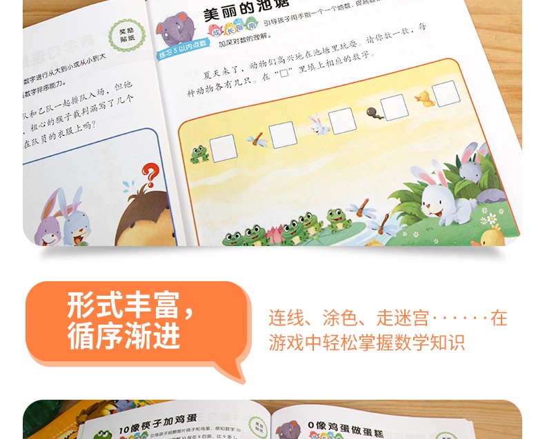 1.本书是针对3-4岁儿童智能发展需求编写的数学学习用书。通过阶梯式分册训练,有针对性地提高不同阶段孩子的数学思维能力、逻辑思维能力,助力孩子大脑潜能的全面开发。 2.阶梯数学按年龄段分为六册,针对孩子年龄段由浅入深、由易到难的程度进行编排,循序渐进。 3.以幼儿的认知水平和兴趣点为基础,让孩子在游戏中获得智慧,系统而理论化地训练孩子的大脑,从而提高孩子的数学思维。 4.本书通过排序、比较、时空感知等游戏,将精美的画面与训练内容相关联,充分利用生活中的事物让孩子感知数学的用处,在游戏的过程中顺利完成智能的提升。 5.希望本套丛书能让孩子体会到独立解决问题的成就感与自信心。帮助孩子开拓思维,打开智慧的大门,在思维中收获快乐。 6.安全油墨,环保印刷,家长更放心。