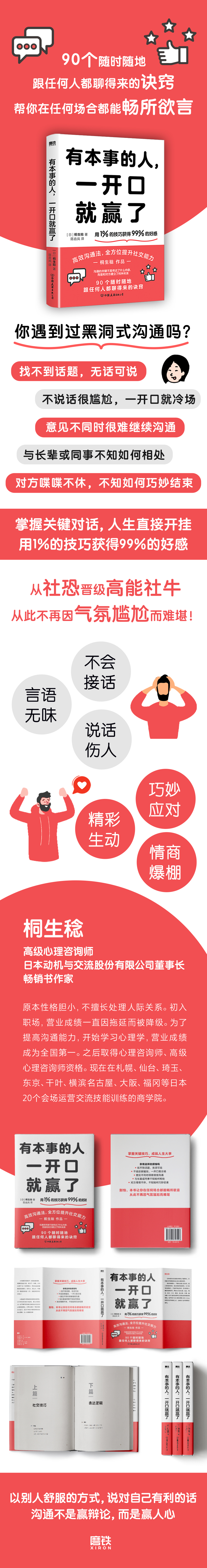 "Chapter6 提高沟通能力的技巧 三流泯然众人;二流好似AI;一流会怎么说? AI正以不可思议的速度发展着。我们有理由相信,一个新的时代已近在眼前:所有问题都可以丢给AI去解决。 那么,说明这一领域又如何呢?具有语言处理功能的AI也正在开发中,如果进展顺利,说不定在不久的将来就能发明出接待机器人,事无巨细地回答客户的种种问题。也许,“说明就交给AI去做吧!”的时代已经不远了。 不过,AI也有其弱点所在,那就是难以处理人类的感情。很多时候,人们说的话往往都有着潜台词。“他虽然看上去精神还不错,不过总觉得和以前哪里不一样了”“表面上是这么说,心里其实是那样想的”…… 只有人类才能处理这种复杂的情感。 的确,在分析处理感情方面,AI研究也正如火如荼地推进着,它们的系统能够从声音或是神态上分析人的情感。然而,这种分析是建立在过去的数据基础之上的。此时此刻,这个人的情感到底如何,除了真正站在他面前的人以外,没有任何别的人能够知道。 当人们在电话中说“我倒是没什么别的事……”“精神倒也还好……”的时候,他一定是有潜台词的,人类能比AI更敏锐地察觉到这一点。 本书的中心思想,就是希望教会读者如何体察对方的感情。对方期待的说明是怎样,超越对方期待的说明又是怎样,我最想教会大家的,是如何站在对方的角度思考问题。交流的本质正是站在对方的立场进行实践,而一流之人对此心知肚明。 我们要如何才能做到站在对方的立场进行实践?除了大量的经验以外,别无他法。我们要与各种各样的人进行交流,亲身经历各种各样的事,才能获得敏锐地体察对方情感的能力:去伤害他人、别他人所伤害、去做好事、去做坏事…… 也许有人会认为,优秀的销售是在磨炼好技巧之后再去接待客户的,但我认为并非如此。正因为接待过大量的客户,优秀的销售才得以磨炼技巧、提升自我。说明也是一个道理。并非是擅长说明所以才去进行大量的说明,而是因为有了大量的说明,人才会变得擅长说明。 体察对方的情感,再进行说明。我这是AI无法做到的,唯有有血有肉的人类才能做到的真正的说明。" "90个随时随地跟任何人都聊得来的诀窍 帮你在任何场合都能畅所欲言 从社恐晋级高能社牛 从此不再因气氛尴尬而难堪!"