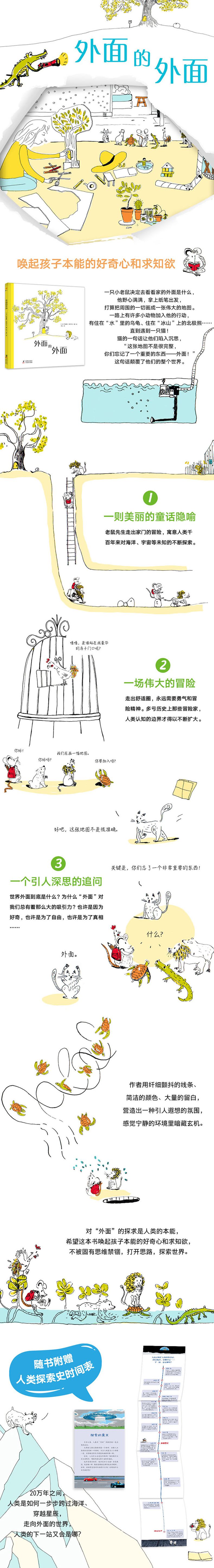1.一则美丽的童话隐喻:老鼠先生走出家门的冒险,寓意人类千百年来对海洋、宇宙等未知的不断探索。 2.一场伟大的冒险:走出舒适圈,永远需要勇气和冒险精神。多亏历史上那些冒险家,人类认知的边界才得以不断扩大。 3.一个引人深思的追问:世界外面到底是什么?为什么“外面”对我们总有着那么大的吸引力?也许是因为好奇,也许是为了自由,也许是为了真相…… 4.对“外面”的探求是人类的本能,希望这本书唤起孩子本能的好奇心和求知欲,不被固有思维禁锢,打开思路,探索世界。 5.随书附赠人类探索史时间轴,20万年之间,人类是如何一步步跨过海洋、穿越星辰,人类的下一站又会是哪? 究竟什么是外面?外面的世界到底是什么样?一则看似简单的故事,结局却出乎意料,让人对自身和世界的联系产生深思。自古以来,人类始终进行着对外界世界的探索,从最开始的远古人走出洞穴、到哥伦布远航跨越海洋、再到今天驾驶飞船驶向太空…… 对孩子们来说,这样能引发思考的绘本是书架上不可缺少的选择。好书要能够引导孩子发问、启发孩子进行想象,人类的不断进步正是因为无数先辈牢牢记着孩时的梦想啊。