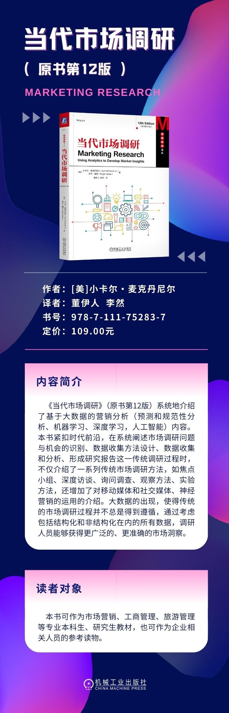 当代市场调研 (原书第12版) 出版时间 2024-05-01T00:00 市场营销 79628 作者: (美)小卡尔·麦克丹尼尔(Carl McDaniel Jr.) 出版社: 机械工业 原售价: 109.00 折扣价: 81.80 折扣购买: 当代市场调研 (原书第12版) ISBN: 9787111752837 作者简介 小卡尔·迈克丹尼尔,得克萨斯大学阿灵顿分校市场营销系主任,出版有《营销学原理》、《当代市场调研》等11部著作,担任《企业研究学报》编委,日内瓦国际贸易中心高级顾问,1992年被美国西南市场营销学会授予“杰出调研员”的称号。 罗杰·盖兹,DDS调研公司总裁,并担任《应用市场调研》和《数据收集学报》等刊物的编委。 内容简介 全面介绍市场调研知识和应用 上一篇:管理秘书实务精讲与实训(第2版21世纪经济管理精品教材)/文秘系列下一篇:营销科学手册