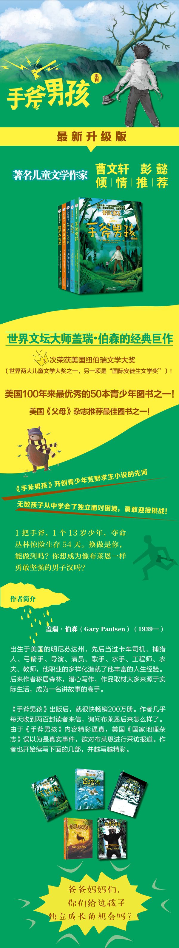 盖瑞·伯森Gary Paulsen(1939——),出生于美国的明尼苏达州,先后当过卡车司机、捕猎人、弓箭手、导演、演员、歌手、水手、工程师、农夫、教师,他职业的多样化造就了他丰富的人生经验。后来作者移居森林,潜心写作,作品取材大多来源于实际生活,成为一名讲故事的高手。 《手斧男孩》出版后,就很快畅销200万册。作者几乎每天收到两百封读者来信,询问布莱恩后来怎么样了。由于《手斧男孩》内容精彩逼真,美国《国家地理杂志》误以为是真实事件,欲对布莱恩进行采访报道。 作者也开始续写下面的几部,并越写越精彩。1987年《手斧男孩》荣获美国知名大奖纽伯瑞奖(世界两大儿童文学大奖之一,另一项是“国际安徒生文学奖”),被评为美国100年来非常优秀的50部青少年图书之一。