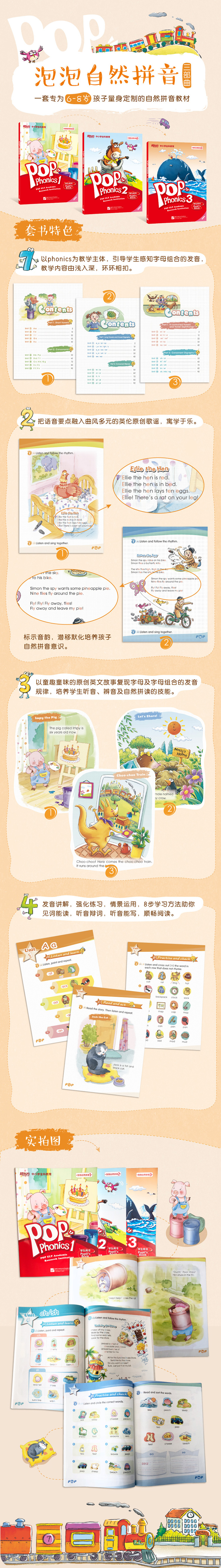 基本资料 Phonics又叫字母拼音或自然拼读,是一种自然形成的发音规则,根据“字母”和“字母”间组合所应该发出的音,由浅入深、反复练习,建立字母与发音的直觉音感。 本套教材共分为三个级别,每级均含一本学生用书和一本活动用书。同时,扫描封底的二维码,可以获取全书的音频。第一级别主要学习短元音和辅音在单词中的自然拼音规则;第二级别主要学习长元音、复合元音及辅音组合等自然拼音规则;第三级别主要学r元音、双元音及复合辅音的自然拼音规则。三个级别难度层层递进,环环相扣,可帮孩子在自然拼读的世界自由探索。此外,为了丰富学生的学习体验,方便学生高效地学习自然拼读,本书增加了点读功能。 点读笔需单独购买,咨询电话:400-169-8377。