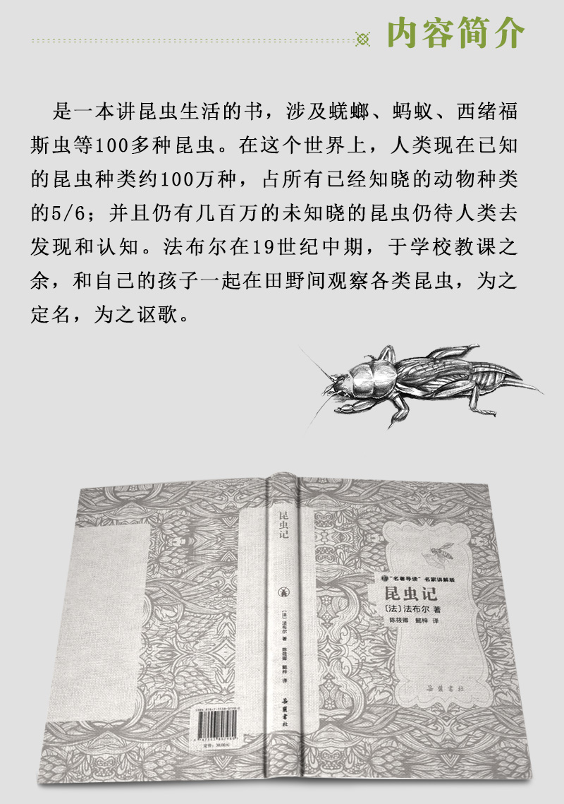 昆虫记(名著导读名家讲解版)(精) 出版时间 2018-04-01T00:00 文学评论与鉴赏 44865 作者: (法)法布尔|译者:陈筱卿//懿梓 出版社: 岳麓 原售价: 30.00 折扣价: 0.00 折扣购买: 昆虫记(名著导读名家讲解版)(精) ISBN: 9787553807980 作者简介 内容简介 上一篇:罗念生全集(增订典藏版共10册)(精)下一篇:四大名著名家点评(共7册)(精)