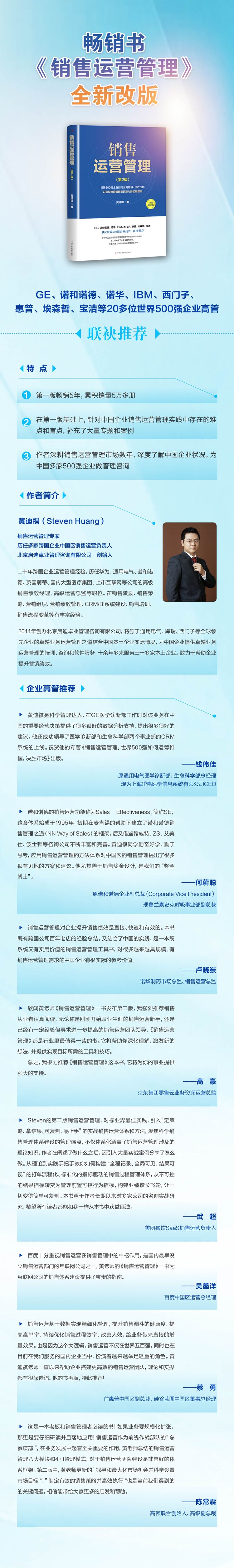 第1章 销售运营管理: 世界500强攻城略地的幕后参谋 《孙子兵法》是世界兵书之最,其深邃的谋略思想深远地影响了全球的商战,为世界各国企业所推崇。《孙子兵法》的核心思想是“上兵伐谋”,强调战前谋略和筹划是战争的上乘艺术和决定胜负的关键因素,它将《始计篇》放在第一篇,开宗明义指出,决定战争成败的首要任务在于战前谋划:“夫未战而庙算胜者,得算多也;未战而庙算不胜者,得算少也。多算胜,少算不胜,而况于无算乎!吾以此观之,胜负见矣。”书中用大量的篇幅介绍战前谋划,如《始计篇》《谋攻篇》阐述战前对整体形势和竞争对手的全方位的分析和度量,《用间篇》阐述情报搜集的意义和方法,并留下了“故上兵伐谋,其次伐交,其次伐兵,其下攻城”“知彼知己者,百战不殆;不知彼而知己,一胜一负;不知彼不知己,每战必败”等关于战前谋划的至理名言。 无独有偶,西方战争之父克劳塞维茨《战争论》也描述道:我们所知的每一场战争,其实早在战争开始之前就已经结束了(战争的部署、对胜负结局的预见早已在指挥官脑海中预演过多遍了)。作者高度评价了战前谋划对于战争胜负的作用。 商战亦是如此,我们看到某个跨国企业在中国市场攻城略地,成功抢占了某块市场、成功推出了某个产品,事实上都是幕后一系列苦心孤诣谋划的结果,是幕后一系列形势分析、谋划判断和关键决策的结果,这些决策包括以下一系列问题:市场机会在哪里?开发哪些目标客户?如何开发?策略是什么?如何设计销售组织支持战略落地?如何排兵布阵?如何针对性投放资源?如何绩效追踪、激励人员以确保销售战略执行到位…… 那么问题来了,跨国企业中是谁在幕后承担这项“庙算”的工作?是谁对这些关键决策提出建议、对策和方案?是谁负责市场、竞争情报和数据的搜集和分析?他们又是如何进行这一系列“庙算”工作的? 在跨国企业,承担这个“作战参谋”职能的部门叫作“销售运营部”,本书将介绍这个部门的实践,以及他们运筹帷幄,决胜市场的思路、方法和工具——“销售运营管理之道”。 GE、诺和诺德、诺华、IBM、西门子、惠普、埃森哲、宝洁等多位世界500强企业高管联袂推荐。 针对中国企业销售运营管理实践中存在的难点和盲点,第二版补充了大量专题和案例,是一本更完善、实用的销售运营管理工具书。 本书特点: 1. 第一版畅销5年,累计销量5万多册; 2. 在第一版基础上,针对中国企业销售运营管理实践中存在的难点和盲点,补充了大量专题和案例; 3. 作者深耕销售运营管理市场数年,深度了解中国企业状况,为中国多家500强企业做管理咨询。