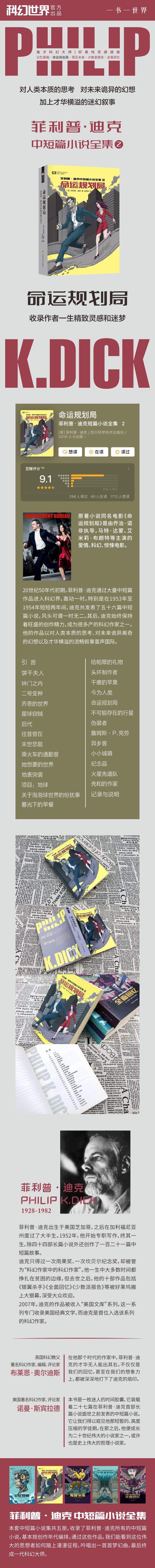 无 在他那个时代的作家中,菲利普·迪克的才华无人能出其右。不仅仅是我们的回忆,甚至在我们的想象力上,都被深深地打下了迪克的烙印。 ——英国科幻教父 著名科幻作家、编辑、评论家 布莱恩·奥尔迪斯