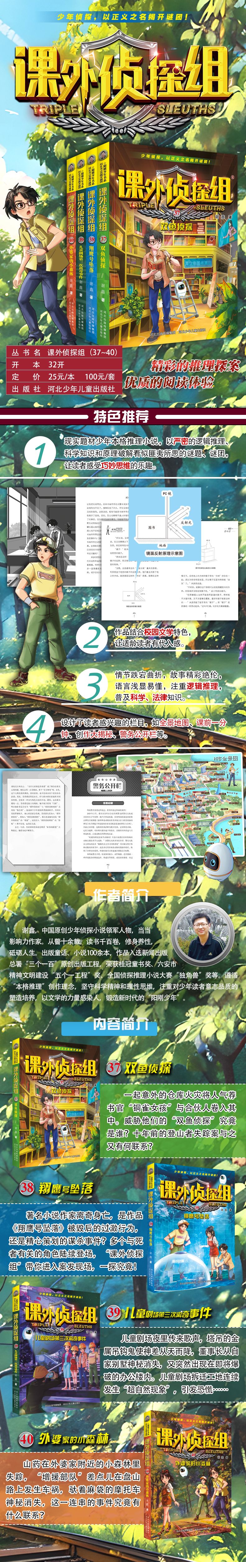 谢鑫,中国原创少年侦探小说领军人物,当当影响力作家。从警十余载,读书千百卷,修身养性,砥砺人生。出版童话、小说100余本,作品入选新闻出版总署“三个一百”原创出版工程,荣获桂冠童书奖、六安市精神文明建设“五个一工程”奖、全国侦探推理小说大赛“独角兽”奖等。遵循“本格推理”创作理念,坚守科学精神和理性思维,注重对少年读者意志品质的塑造培养,以文学的力量感染人,锻造新时代的“阳刚少年”。