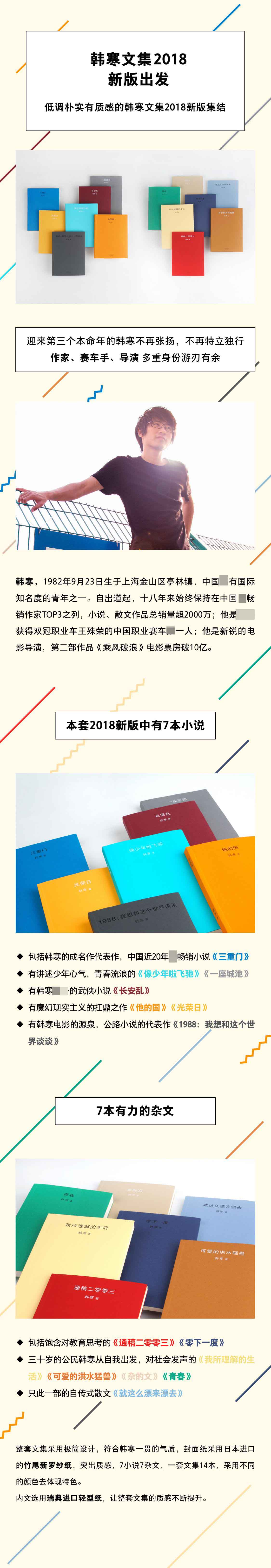 韩寒,1982年9月23日生于上海金山区亭林镇。他是年少成名的畅销书作家,十八年来始终保持在中国最畅销作家TOP之列,小说、散文作品总销量超2000万,主编《独唱团》畅销500万册;他也是乘风破浪的赛车选手,获得中国场地、拉力双冠职业车王殊荣;他还是优秀的歌手和词作者。 2014年凭借处女作《后会无期》跨入导演行列,获得第9届华语青年影像论坛年度新锐编剧奖,中国电影导演协会2014年度表彰大会“年度青年导演”提名,第二部作品《乘风破浪》电影票房破10亿。 韩寒大事记 1982年9月23日生于上海金山区亭林镇。 1997年在《少年文艺》发表作品; 1999年凭借《杯中窥人》获第一届新概念作文大赛一等奖,次年蝉联; 2000年出版长篇小说《三重门》; 2001年出版文集《零下一度》; 2002年出版长篇小说《像少年啦飞驰》; 2003年出版杂文集《通稿2003》,同年开始职业赛车生涯; 2004年出版《五年文集》、长篇小说《长安乱》; 2005年出版赛车随笔《就这么漂来漂去》; 2006年出版长篇小说《一座城池》; 2007年出版长篇小说《光荣日》; 2008年出版《杂的文》; 2009年出版长篇小说《他的国》、文集《可爱的洪水猛兽》; 2009年拿下场地赛和拉力赛的双料年度总冠军; 2010年4月被评为“全球*影响力一百人”之一,登上美国《时代周刊》封面; 2010年9月,出版长篇小说《1988:我想和这个世界谈谈》; 2011年出版文集《青春》; 2013年出版文集《我所理解的生活》; 2014年拍摄电影《后会无期》; 2016年拍摄电影《乘风破浪》。与拉力双冠军