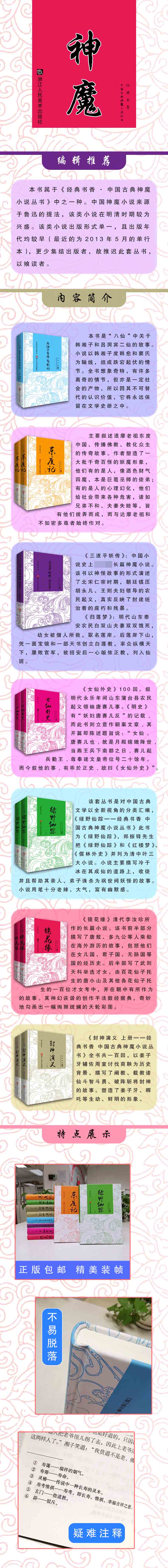 头戴铁道冠,鱼尾模样;身穿皂①沿边烈火绯② 袍。左手提着荆筐篮,右手拿着鳖壳扇。行缠③绞脚 ,多耳麻鞋。原来神仙有四等: 走如风,立似松,卧如弓,声似钟。只见那先生 揭起布帘人来,看着主管。主管见他道貌非俗,急起 身迎人解库,与先生施礼毕,凳上分宾主坐了,忙唤 茶来。茶毕,主管道:“我师有何见谕?”那先生道 :“告主管,此间这个典库,是专当琴棋书画的么? ”主管道:“然也!”先生道:“贫道有一幅小画, 要当些银两,日后便来取赎。”主管道:“我师可借 来观一观,看值多少。”主管只道有人跟随他来拿着 画,只见那先生去荊筐篮内,探手取出一幅画来,没 一尺阔,递与主管。主管接在手里,口中不说,心下 思量:“莫不这先生作耍笑?跳起来④这画儿值得多 少?”不免将画儿叉将起来看时,长不长五尺;把眼 一观,用目一望,原来是一幅美女图。画倒也画得好 ,只是小了些,不值什么钱。主管回身问道:“我师 要解⑤多少?”只见这先生道:“这画非同小可,要 解伍拾两银子。”主管道:“告我师!只怕当不得这 许多。若论这一幅小画儿,值也不过值三五十贯钱, 要当伍拾两银子,如何解得?”这先生定要当,主管 再三不肯。两个正较论⑥之间,只听得鞋履响,脚步 鸣,中间布幕起处,员外走将出来,道:“主管,烧 午香也未?”主管道:“告员外,烧午香了!”那先 生看着员外道:“员外,稽首!”员外答礼道:“我 师,请坐拜茶!”员外只道他是抄化的。主管道:“ 此位师父有这幅小画,要当伍拾两银子,小人不敢当 ,今我师定要当。”员外把眼一觑,道:“我师这画 虽好,不值许多,如何当得伍拾两?”那先生道:“ 员外!你只知其一,不知其二。这幅画儿虽小,却有 一件奇妙处。”员外道:“有甚奇妙处?”先生道: “此非说话处,请借一步方好细言。”员外与先生将 着手①径进书院内,四顾无人,员外道:“这画果有 何奇妙?”先生道:“这画于夜静更深之时,不可教 一人看见,将画在密室挂起,烧一炉好香,点两枝烛 ,咳嗽一声,去桌子上弹三弹,礼请仙女下来吃茶。 一阵风过处,这画上仙女便下来。”那员外听得,思 忖道:“恁地是仙画了!”即同先生出来,交主管: “当与师父去罢。”主管道:“曰后不来赎时,却不 干小人事。”员外道:“不要你管,只去簿子上注了 一笔便了。”员外一面请先生吃斋,就将画收在袖子 里,却与先生同人后堂里面坐定吃斋罢,员外送先生 出来,主管付伍拾两银子与他,先生辞别自去。不在 话下。 员外在家巴不得到晚,叫当值的打扫书院,安排 香炉、烛台、茶架、汤罐之类,觉到晚也,与妈妈吃 罢晚饭,只见员外思量个计策,道:“妈妈,你先去 歇息,我有些账目不曾算清,片时算了便来。”不觉 楼头鼓响,寺内钟鸣,看看天色晚了。但见: 十分俄然黑雾,九霄云里星移。八方商旅,回店 解卸行装;七星北斗,现天关高垂半侧。绿杨荫里, 缆扁舟在红蓼滩头;五运光中,竟赶牛羊入團。四方 明亮,耀千里乾坤;三市夜横凉气。两两夫妻归宝帐 ,一轮皎洁照军州。胡员外径到书院,推开风窗,走 进书院里面。吩咐当值的:“你们出去外面伺候。” 回身把风窗门关上,点得灯明了,壁炉上汤罐内汤沸 沸地滚了。员外烧一炉香,点起两支烛来,取过画叉 ,把画挂起,真个是摘得落①的娇娆美人。员外咳嗽 一声,就桌子上弹三弹,只见就桌子边微微地起一阵 风。怎见得这风? 善聚庭前草,能开水上萍;动帘深有意,灭烛太 无情。入寺传钟响,高楼送鼓声;唯闻千树吼,不见 半分形。风过处,只见那画上美人历历地一跳,跳在 桌子上;桌子上一跳,跳在地上。这女子脚到头五尺 三寸身材,生得如花似玉,白的是皮肉,黑的是头发 。怎见得有许多好处? 添一指太长,减一指太短。施朱太赤,傅粉太白 。不施脂粉天然态,纵有丹青画不成。有沉鱼落雁之 容,闭月羞花之貌。只见那女子觑着员外,深深地道 个万福。那员外急忙还礼,去壁炉上汤罐内倾一盏茶 递与那女子,自又倾一盏茶陪奉着。吃茶罢,盏托归 台,不曾道个什么,那女子一阵风过处,依然又上画 上去了。员外不胜之喜,即时自收了画,叫当值的来 收拾了,员外自回寝室歇息。不在话下。自此夜为始 ,每日至晚便去算账。 却说张院君思忖道:“员外自前到今,约有半月 光景,每夜只说算账,我不信有许多得算。”不免叫 丫环将灯在前,妈妈在后,径到书院边,近风窗听时 ,一似有妇人女子声音在内。妈妈轻轻地走到风窗边 ,将小姆指头蘸些口唾,去纸窗上轻轻地印一个眼儿 ,偷眼一张,见一个女子与员外对坐了说话。这妈妈 两条愤气从脚板底直灌到顶门上,心中一把无明火高 了三干丈,按纳不下,舒②着手,推开风窗门,打入 书院里来。员外吃了一惊,起身道:“妈妈做什么? ”那妈妈气做一团,道:“做什么?老乞丐!老无知 !做得好事! P4-6 本书属于《经典书香·中国古典神魔小说丛书》中之一种。中国神魔小说来源于鲁迅的提法,该类小说在明清时期较为兴盛。该类小说出版形式单一,且出版年代均较早(最近的为2013年5月的单行本),更少集结出版者,故推迟此套丛书,以飨读者。
