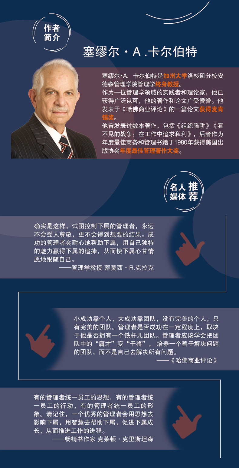 塞缪尔?A.卡尔伯特 塞缪尔?A.卡尔伯特是加州大学洛杉矶分校安德森管理学院管理学终身教授。此外,他还是NTL实用行为科学学院的组织学研究的项目部主任。卡尔伯特教授拥有美国西北大学工业工程的理学学士学位和加州大学洛杉矶分校临床心理学博士学位。卡尔伯特教授作为一位管理学领域的实践者和理论家,已获得广泛认可,他的著作和论文广受赞誉。他发表于《哈佛商业评论》的一篇论文获得麦肯锡奖。他曾发表过数本著作,包括《组织陷阱》《看不见的战争:在工作中追求私利》,后者作为年度最佳商务和管理书籍于1980年获得美国出版协会年度最佳管理著作大奖。《激进的管理:权力、政治和追求荣誉》一版再版。《思维模式管理:领导力的核心》由牛津大学出版社出版于1996年,在大众图书市场受到广泛赞扬。《别杀死经理!摆脱人事陷阱》出版于2001年,受到管理评论学会特别关注。此外,卡尔伯特教授长期关注组织效率、领导力提升、团体战略等,是各类私立或公立团体部门、小公司和财富500强企业的特聘顾问。他拥有丰富的海外咨询和讲授经验。