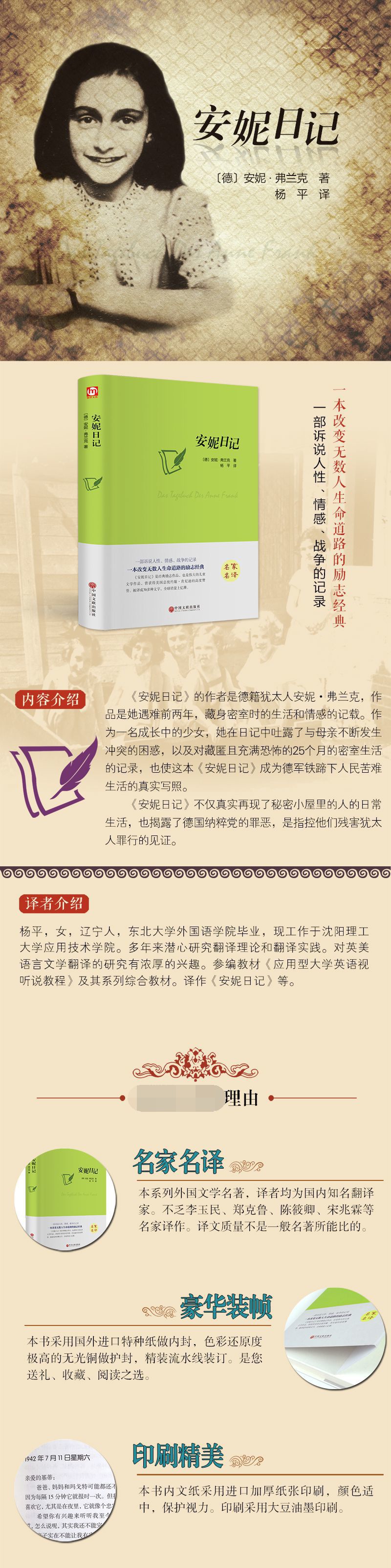 安妮·费兰克,1929年生于德国的法兰克福,是德籍犹太人。1942年6月12日,当她13岁生日时,她父亲送给她一本当作生日礼物的日记本,于是她从那个时候开始写日记了。同年7月6日,由于纳粹开始迫害犹太人,他们全家躲进了安妮父亲公司的密室。之后,另外4名犹太人也陆续躲进了密室。 两年以后的1944年8月4日,由于有人告密,躲在密室的8个人被德国警察逮捕。1个月后,8个人被转送到奥斯威辛集中营。之后,安妮与姐姐又被转送到贝尔根一贝尔森集中营。1945年3月,姐妹俩都因伤寒死于集中营。 安妮的日记由公司女职员保存下来,之后又转交给安妮的父亲。1947年,安妮的父亲将女儿的日记整理出版,她的事迹后来被拍成电影《安妮日记》。 杨平,女,毕业于东北大学外国语学院,现任职于沈阳理工大学外语系。多年来潜心研究英语翻译理论和翻译实践。出版译作《安妮日记》等。