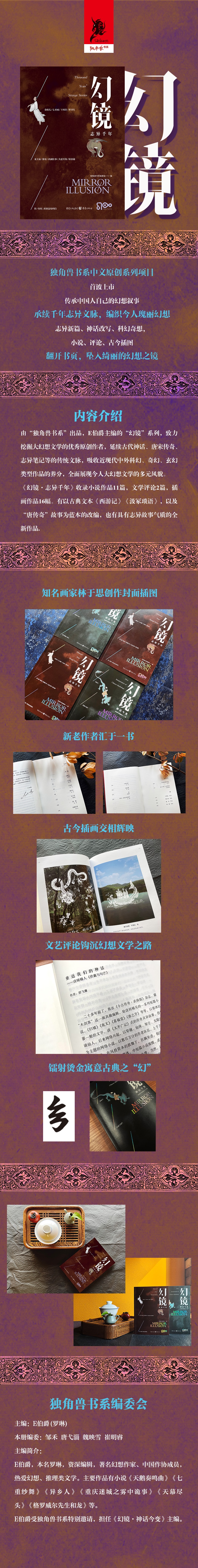 ·独角兽书系编委会,从数百篇来稿中,集结11位潜力作者,11篇异彩纷呈的幻想作品。在这些作品中,有以古典文本《西游记》《汲冢琐语》,以及“唐传奇”故事为蓝本的改编,也有具有志异故事气质、书写当代生活的全新作品。这些作品各具特色,全面地展现了青年作者在幻想文学创作上的风貌。 ·特别邀请百万粉大V读书博主、网络文学评论家安迪斯晨风,跨类型小说作家竞天泽为《幻镜》一书专门创作文学评论。安迪斯晨风梳理了近二十年本土奇幻文学的发展,同奇幻迷一齐回顾青葱岁月;竞天泽为打破类型的藩篱高举大旗,希望让故事回归故事本身。 ·封面插图由当代艺术家林于思创作,极具现代感的设计和古典幻想融为一体。 ·收录插画师不周仙、魏小威的插图作品,以及古典绘画作品,艺术创作古今辉映。