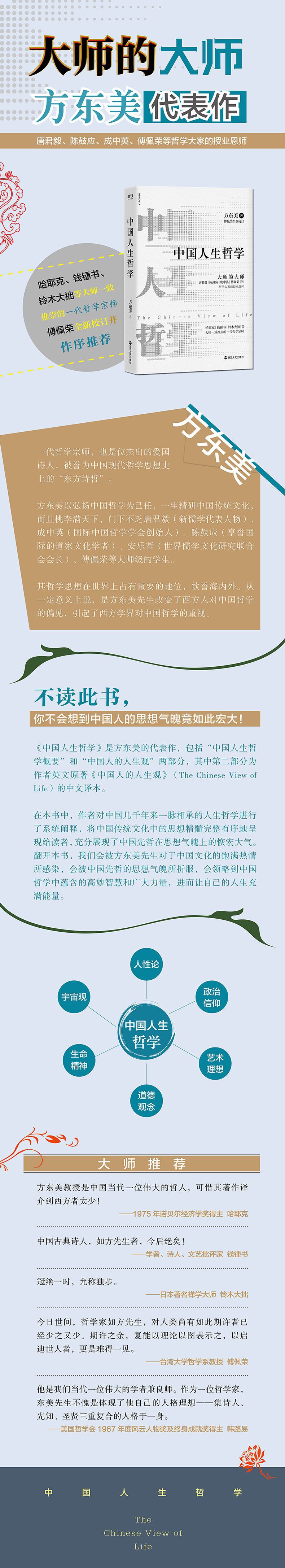 \"什么是中国先哲的人生哲学 诸位,在这里,我所要讲的题目是中国先哲的人生哲学概要。这个题目的范围非常广泛,意义极其重要,在未讲解以前,先要郑重地向诸位提出一个疑问,这便是:你们心中有哲学吗? 诸位看我这样发问,或许要嫌我唐突,但我之所以如此发问,却有个道理。英国文学家萧伯纳尝说:“你们不能相信荣誉,除非你们曾获得荣誉。”现在,我也仿萧伯纳的口气说:“除非你们心中先有了哲学,否则是不会了解哲学的。” 照目前的形势看来,全国上下颇有反对哲学的趋势,一般人沾染近代西洋功利主义的习气甚深,以为哲学对于我们的生活是无用的,时常有人说,哲学不能烘面包,要它做什么?诚然不错!哲学不能烘面包,但我要问,人生的目的是吃面包吗?即就这层而论,西洋亦尚有个谚语:哲学虽然不能烘面包,但可以使面包增加甜味。 我们处在社会上,不仅要生活,更需启发深刻的思想,培养优美的情趣,使我们的生命内容日益丰富,使我们的生命意义更加完善,使我们的生命价值逐渐提高。哲学不仅仅教我们生活,因为生活是我们的本能要求,用不着哲学来教导,但如何生活才能获得意义,如何生活才能实现价值,这却是哲学上重大的问题。罗马哲学家西塞罗(Cicero)赞美哲学说:“哲学!人生之导师,至善之良友,罪恶之劲敌,假使没有你,人生又值得什么!” 诸位要知道,哲学不能烘面包,不是它的缺点,只图吃面包的人不必有哲学,也必不能有哲学。倘若吃面包还要咀嚼其美味,便少不了甘蜜或甜酱。哲学之于人生,不只是一块黑面包,而是一瓶甘蜜、一罐甜酱。诸位吃过黑面包吗?它的味道如何?诸位也吃过涂满甘蜜甜酱的面包吧?它的味道又如何? 说了这一段话之后,我仍旧要问:全国可爱的青年,你们心中有哲学吗? 哲学的领域异常广大,拿一句笑话来譬喻,我们可以说,比《红楼梦》中的“大观园”还要大无数倍。你们现在第一次踏入哲学的宫门,要想一一探索哲学问题的意味,岂不像刘姥姥初进大观园,只见满园景物都是耀眼争光,使人头昏目眩吗? 现在,为节省时间起见,且撇开哲学的大观园全景不谈,只择要叙述中国人生哲学的“荣国府”。诸位听了这句话,或许要疑惑,中国人生哲学是何等高尚的思想境界,哪能拿一个凡俗的“贾府”来作比喻?诸位且莫责难,听我说来。“贾府”正当盛时,聚了许多富有才情的人在一起过活,轰轰烈烈,煊赫一时,等到式微衰败之后,被西平王率领番役查抄,便引起焦大在门前噪闹哭骂。中国近百年来,国势衰弱,西洋势力侵略过来,抄没了我们的文化家当,更有焦大一流人在那儿谩骂我们自己不长进,甚且辱及先哲,诬蔑中国根本没有文化。诸位仔细想一想,这成什么话! 谁是中国先哲?他们的人生哲学包括几层问题?这两点说起来非常复杂,现在只好拿童话故事来打比方。 相传有一个国王和一个教主互争雄长,教主平日养尊处优、豪华盖世,国王眼见财富为人分润,极不甘心。有一天,国王特约教主会晤,责他不应该非分奢华,损人利己。于是,向他提出三个难题,限期答复。这些难题是:一、宇宙之中心在哪儿?二、周游世界,需要多长时间?三、指点国王心中隐藏的思想是什么? 教主听了这些难题,起初以为只是开玩笑,哪知国王竟提出最后的警告,谓如教主不能准期作答,国王将严厉惩罚教主,使之身首异处。教主听了这个警告,心惊胆战,四处访求智者大师为之解难,竟无所遇,只得垂头丧气,奔回寺院。中途忽有一位牧羊人拦路询问,教主忧心忡忡地把国王所要挟的难题向之一一诉述。原来,这位牧羊人是个绝顶的天才,心中满储智慧,因向教主说道:“这又何妨!等到限期到了,我将换着你的盛装,趋近国王,答复任何难题,万一不幸,便牺牲我的性命,抵死亦要为你解除大难。” 到了满期那一天,牧羊人扮作教主模样,带着许多扈从,奔向国王的所在,理直气壮地说道:“我现在准备答复你的问题。”国王急遽问道:“第一,请指点宇宙的中心何在?”牧羊人听了,从从容容地将手中的圭杖向地上一插,并说:“宇宙的中心就在这里。君王如果不信,请穿地测量以为验。”国王听了无话可说,乃更问道:“周游世界一匝,需时几何?”牧羊人又答:“明晨太阳从东方起来,君王若能驾车追随其后,从天而游,从今晨到明晨,一日之间当可绕地一匝。”国王接着又发第三问:“请指出我心中所想的究竟是什么?”牧羊人毫不迟疑,自答道:“君王心中以为我是教主。”一边说着,一边卸下教主的装束,还了牧羊人本来面目,说道,“请君王恕我无礼,并求为教主解难。”从此以后,那个国王极其佩服牧羊人的智慧,并且尊重教主的威严。 上述故事隐约中已暗示谁是中国先哲,及其人生哲学问题。假使把那位尊贵的教主譬作中国民族,把那位险毒的国王譬作我们民族的大敌,便知那聪明的牧羊人就是我们历代的先哲,那些难题的答案便是我们民族的人生哲学。 \" \"★大师的大师! 唐君毅(新儒学代表人物)、陈鼓应(享誉国际的道家文化学者)、成中英(国际中国哲学学会创始人)、安乐哲(世界儒学文化研究联合会会长)、傅佩荣(国学大师)等哲学大家的授业恩师方东美先生代表作。 ★大师推崇的一代哲学宗师! 方东美先生是哈耶克(诺贝尔经济学奖得主)、钱锺书、铃木大拙(日本禅学大师)等大师一致推崇的一代哲学宗师。 ★国学大师傅佩荣全新校订并作序推荐。 ★不读此书,你不会想到中国人