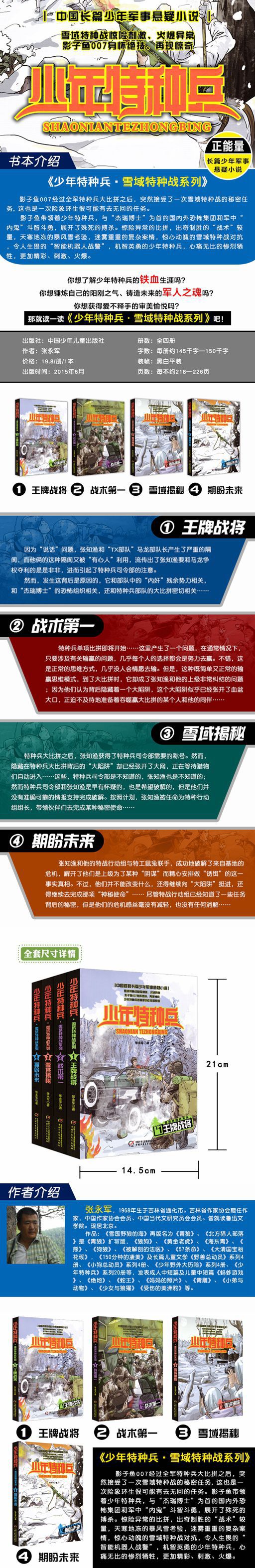 首创多系列少年特种兵题材作品作家 中国**套长篇少年军事悬疑小说 篇幅*长、悬念迭出的特种战故事 人物*多、惊险刺激的正能量原创 《少年特种兵》前六大系列惊险刺激,火爆热销110万册!!! 新四册《少年特种兵·雪域特种战系列》故事更加精彩!!! 《少年特种兵·特战特训系列》6册(**辑)独树一帜,屡获大奖!!! 《少年特种兵·丛林特种战系列》6册(第二辑)悬疑跌宕,好评如潮!!! 《少年特种兵·海岛特种战系列》4册(第三辑)精彩纷呈,极为畅销!!! 《少年特种兵·沙漠特种战系列》4册(第四辑)故事奇特,动人心魄!!! 《少年特种兵·草原特种战系列》4册(第五辑)迷雾重重,惊险异常!!! 《少年特种兵·城市特种战系列》4册(第六辑)危机四伏,险象环生!!! 《少年特种兵·雪域特种战系列》4册(第七辑),刺激震撼,更加火爆!!!