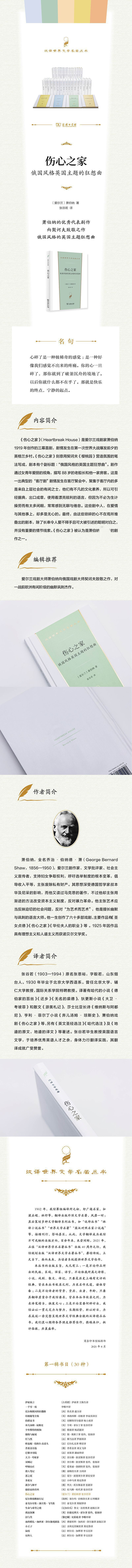 萧伯纳,全名乔治?伯纳德?萧(George Bernard Shaw,1856—1950),爱尔兰剧作家、文学批评家、社会主义宣传者,支持妇女争取权利,呼吁选举制度的根本变革,倡导收入平等,主张废除私有财产。其思想深受德国哲学家叔本华及尼采的影响,而他又读过马克思的著作,不过他却主张用渐进的方法改变资本主义制度,反对暴力革命。他主张艺术应当反映迫切的社会问题,反对“为艺术而艺术” ,他是擅长幽默与讽刺的语言大师。他一生创作了六十多部戏剧,主要作品有《圣女贞德》《伤心之家》《华伦夫人的职业》等 。1925年因作品具有理想主义和人道主义而获诺贝尔文学奖。 译者简介: 张谷若(1903—1994)原名张恩裕,字毂若,山东烟台人。1930年毕业于北京大学西语系。曾任北京大学、辅仁大学教授、国际关系学院特聘教授。译著有哈代的小说《德伯家的苔丝》《还乡》《无名的裘德》,狄更斯小说《大卫?考坡菲》和散文《游美札记》,莎士比亚长诗《维纳斯与阿都尼》,亨利?菲尔丁小说《弃儿汤姆?琼斯史》,萧伯纳戏剧《伤心之家》等,另有《英文圣经选注》《哈代选注》及《地道的原文,地道的译文》等著述。张谷若毕生教授英国语言文学,于培养优秀英语人才之余,身体力行翻译实践,其翻译成就广受赞誉。