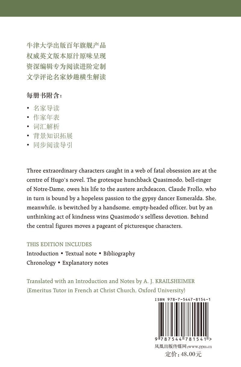 《巴黎圣母院》奠定了雨果作为世界著名小说家的崇高地位,是法国浪漫主义文学的里程碑,小说的情节曲折离奇,紧张生动,变幻莫测,富有戏剧性和传奇色彩,当之无愧地登上了世界十大文学名著的宝座。 全书由牛津大学法语教授A.J.克莱尔谢梅尔(A.J.Krailsheimer)撰写导读并注释。