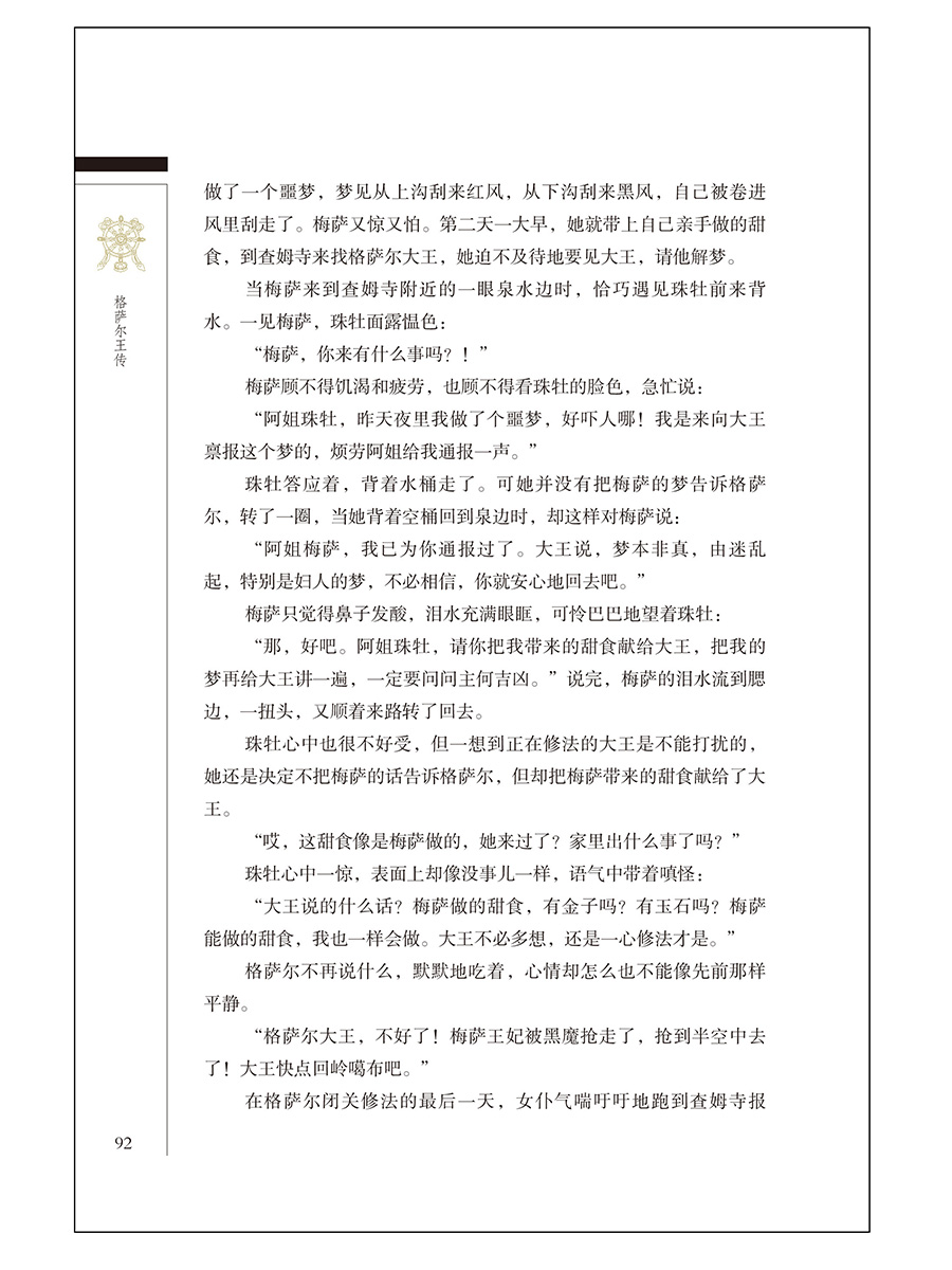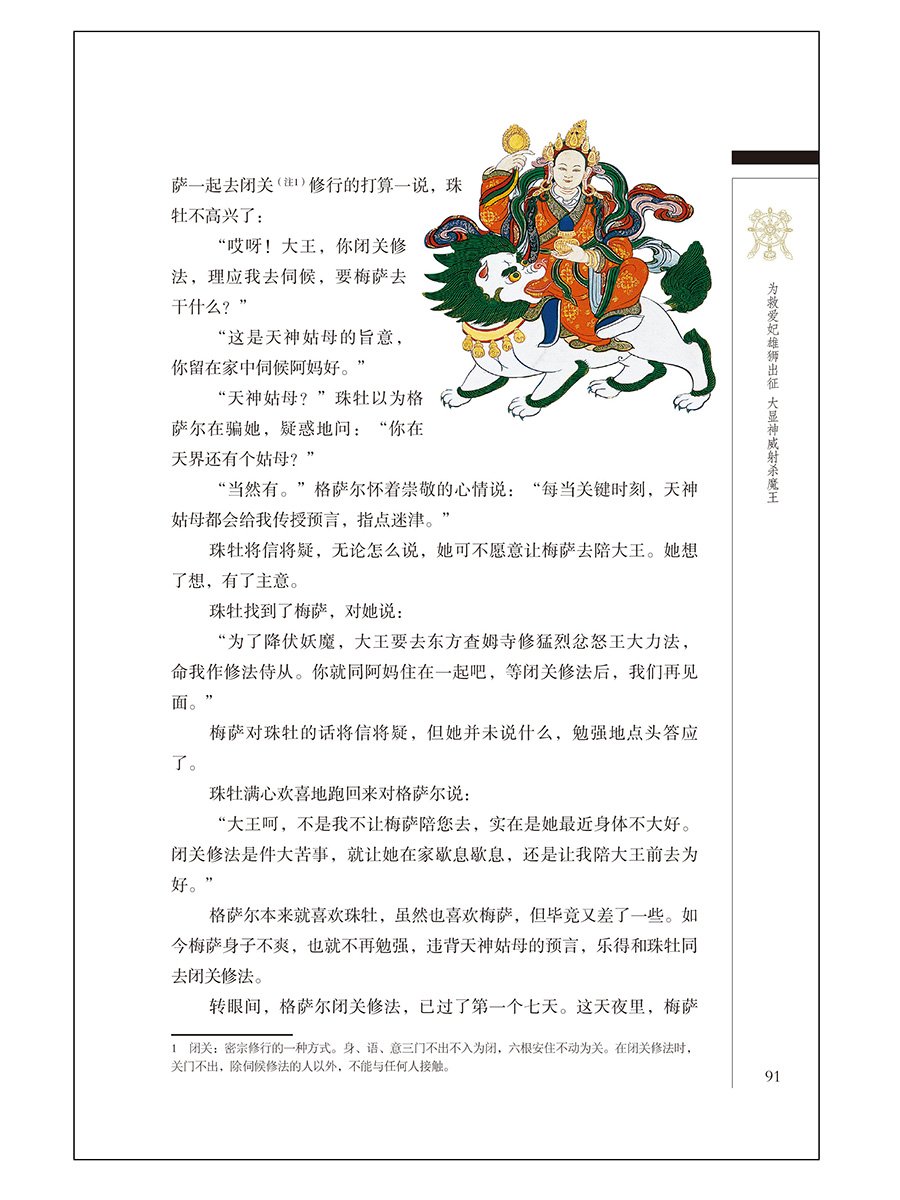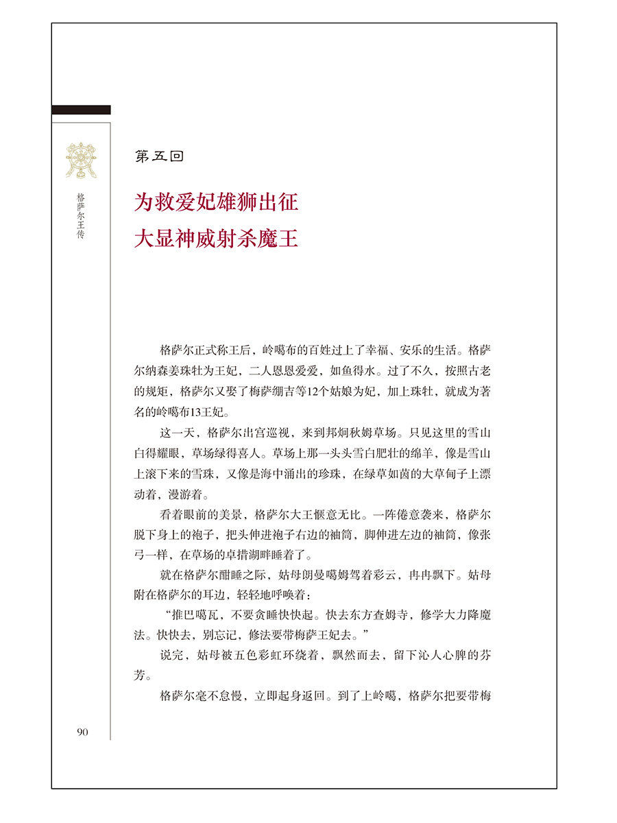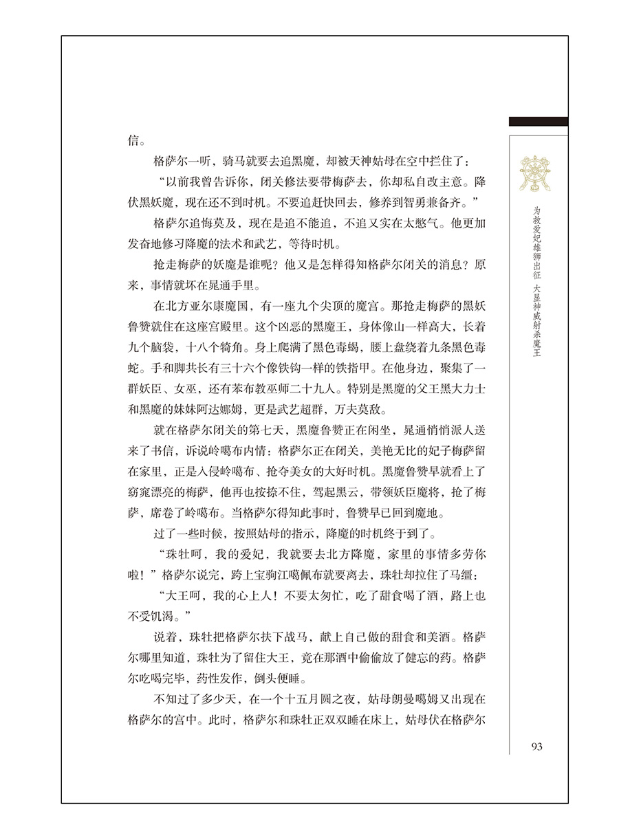 第二回 神子诞生圣地岭域 晁通阴谋陷害觉如 再说人世间,在雪域高原的朵康地区,有个土地 丰饶、百姓富庶的地方叫岭域,又称作岭噶布,峰峦 蜿蜒,美不胜收。岭噶布,意为白业即善业昌盛的地 方。岭噶布分为上、中、下三部。上岭草原辽阔宽广 ,风景秀美;中岭丘陵起伏,常被薄雾笼罩;下岭平 坦如冰湖,熠熠生辉。各部落的帐房如群星密布,牛 羊宛若天上的云朵,不计其数。 岭噶布老总管绒察查根就住在上岭…个名叫“莲 花日出”的小屋里。他的前世是印度一位大修行者, 地位崇高,被称为“智慧老人”,岭域的百姓共同推 举老总管为部落首领。 这天,总管绒察查根早早地就睡下了,睡得又香 又甜。没有多大工夫,他好像觉得天亮了,东面的玛 杰邦日山顶上,现出一轮金色的太阳,照亮整个雪域 之邦。在那太阳的正中间,有一杆金子做的金刚杵。 突然,金刚杵向下飞来,落在岭域中部的神山吉杰达 日顶上。太阳还高高地挂在天上,月亮又升起来了。 这月亮在曼阑山的山顶上隆起,被众星围绕着,光芒 四射。 总管的弟弟森伦王手中拿着一把白绸做顶、绿绸 镶边、黄绸做流苏、金子做把的大伞,从天边走了出 来。那把巨伞,覆盖着雪域之邦广袤的土地,东邻以 律法行政的汉地,西连无比富裕的大食国,南至佛法 昌盛的印度,北接牛羊遍地的霍尔国。西南天空的一 片彩云上,一个戴着莲花冠的上师骑着一头白狮子, 右手握金刚杵,左手拿三叉戟,由众多的仙女陪伴着 。他一边走,一边对绒察查根说: “总管勿睡快起身,普陀落山太阳升,若要日光 照岭域,我唱支歌你来听!”说罢唱道: “在今年孟夏初八的清晨,岭域将会出现吉兆, 所有至尊的上师、诸多祥瑞的灵物,乃至普通的百姓 ,都会聚集在玛迦林的神庙中,举行隆重盛大的召福 法事,一桩终生难逢的大事件即将来临。” 绒察查根刚要问个仔细,那上师和仙女飘然而逝 ,太阳和月亮也都隐去,急得他大叫起来,方知刚才 所闻所见乃是一场梦。 绒察查根从梦中惊醒后,只觉得浑身通泰,心情 兴奋异常,头脑也清醒无比,梦中所见历历在目。他 立即大声呼唤仆人噶丹达鲁,当仆人噶丹达鲁慌慌张 张地来到总管的房间时,只见绒察查根早已把衣服、 靴子穿得整整齐齐,端端正正地高坐在宝座上。 噶丹达鲁心中纳闷,按照平日的规矩,他每天要 念5万遍六字大明咒,21遍祝祷词,做完洒净水、烧 香等一切仪式后,总管才会起床,今天这是怎么了? 莫非有什么大事出现? 不容噶丹达鲁再往下细想,总管开口说话了: “噶丹达鲁,你听着!刚才我做了一个梦,吉祥