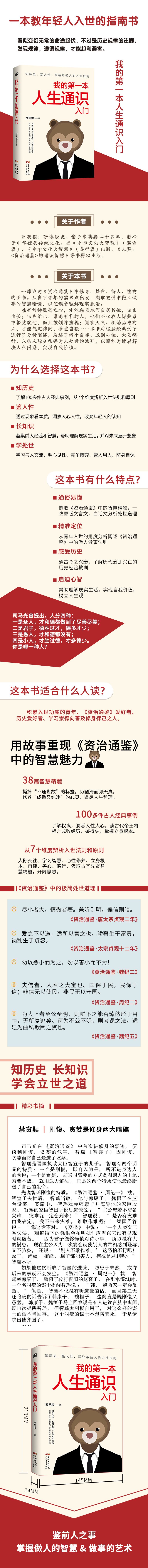 讲诚信∣魏文侯不弃虞人之期 所谓的虞人,就是管理山林的小官。《资治通鉴· 周纪一》载,魏文侯与群臣饮酒,正高兴的时候,下起了大雨,魏文侯却下令备车前往山野之中。左右陪同的臣子说:“今天饮酒正乐,外面又下着大雨,国君将要去哪里呢?”魏文侯说:“我与管理山林的小官约好了去打猎,虽然在这里很快乐,但也不能不遵守当初的约期!”于是前往山野之中,亲自告诉虞人取消打猎。 司马光记载了这样一件小事,表明魏文侯对普通的小人物很尊重。他不是派人去通知虞人,而是亲自去告诉他,并且是冒雨前去,说明魏文侯很守信用。 司马光还记载了一件事,表明魏文侯处理国与国之间的关系也很讲诚信。《资治通鉴· 周纪一》载,韩国向魏国借兵以攻打赵国,魏文侯说:“寡人的国家与赵国,是兄弟之邦,不敢听命。”赵国也向魏国借兵以攻打韩国,魏文侯也是如此回答。两国都怒而离去,不久当他们得知魏文侯对待他们都是这样诚信友善、不两面三刀,便都前来朝拜魏国。魏国于是开始在三晋(魏、赵、韩)之中为大,各诸侯国都不能与它争锋。 司马光还在《资治通鉴· 周纪二》中针对秦孝公不废徙木之赏(即商鞅徙木立信)这个事件进行评论,专门提到四位君主守信用,其中就有“魏文侯不弃虞人之期”。在这个评论中,司马光提出了“夫信者,人君之大宝也”的观点,讲明处于战斗攻伐不已的大争时代,天下都崇尚欺诈和武力,这四位君主尚且不敢忘记树立信用来教育百姓。由此可见,守信用是与人打交道时非常重要的一种品质。 禁贪黩∣刚愎、贪婪是修身两大暗礁 司马光在《资治通鉴》中首次讲修身的事迹,便谈到刚愎、贪婪的危害,智瑶(智襄子)因刚愎、贪婪而将自己送进了坟墓。 智瑶是晋国执政大臣智宣子的儿子。智瑶有两个明显的特质:一个是刚愎,即自以为是,听不进身边人的劝说;一个是贪婪,即通过索要的方式贪图别人的土地,索要不成,就用武力解决。正是这两个特质使他最终断送了自己的生命。 先说智瑶刚愎的特质。《资治通鉴· 周纪一》载,智宣子去世后,智瑶当政,他与韩康子、魏桓子在蓝台设宴。宴席中,智瑶戏弄韩康子并侮辱他的家臣段规。智瑶的家臣智国听说后进谏说:“主公您若不防备灾难,灾难就一定会到来!”智瑶说:“是否有灾难由我确定。我不带来灾难,谁敢作难呢?”智国回答说:“您这话不对。《夏书》中说:‘一个人屡次三番失误,难道结下的怨恨会在明处?应当在它没有显现时就防备。’因为君子能够谨慎对待小事,所以没有大的祸患。现在主公因为一次宴会就使别人的君相感到耻辱,又不防备,还说:‘别人不敢作难。’这恐怕不行吧!蚊子、蚂蚁、蜜蜂、蝎子都能害人,何况是君相呢?”智瑶不听。 如果他这次听取了智国的进谏,防患于未然,或许后来的事就不会发生。《资治通鉴· 周纪一》载,智瑶率韩康子、魏桓子攻打晋阳的赵襄子,在引水灌城时,一个名叫疵的谋士提醒智瑶说:“韩、魏两家一定会反叛。”但是,智瑶不仅没有听进疵的话,而且第二天还将疵的话告诉了韩康子、魏桓子,这简直是既刚愎又愚蠢。韩康子、魏桓子马上回答说是有人进谗言从中离间。疵再次提醒智瑶,但智瑶太刚愎自用了,对这么好的谋士的话不当回事。这个叫疵的谋士不想陪着死,于是请求出使齐国了。 ◆系列图书:之前已出版《我的第一本高情商入门》《我的第一本社会学入门》《我的第一本逻辑思考入门》 ◆通俗易懂:撷取《资治通鉴》中的智慧精髓,一改原版文言文,白话文分析处世道理 ◆精准定位:从青年入世的角度,分析阐述做人的智慧&做事的艺术 ◆启迪心智:树立人生观、价值观、世界观